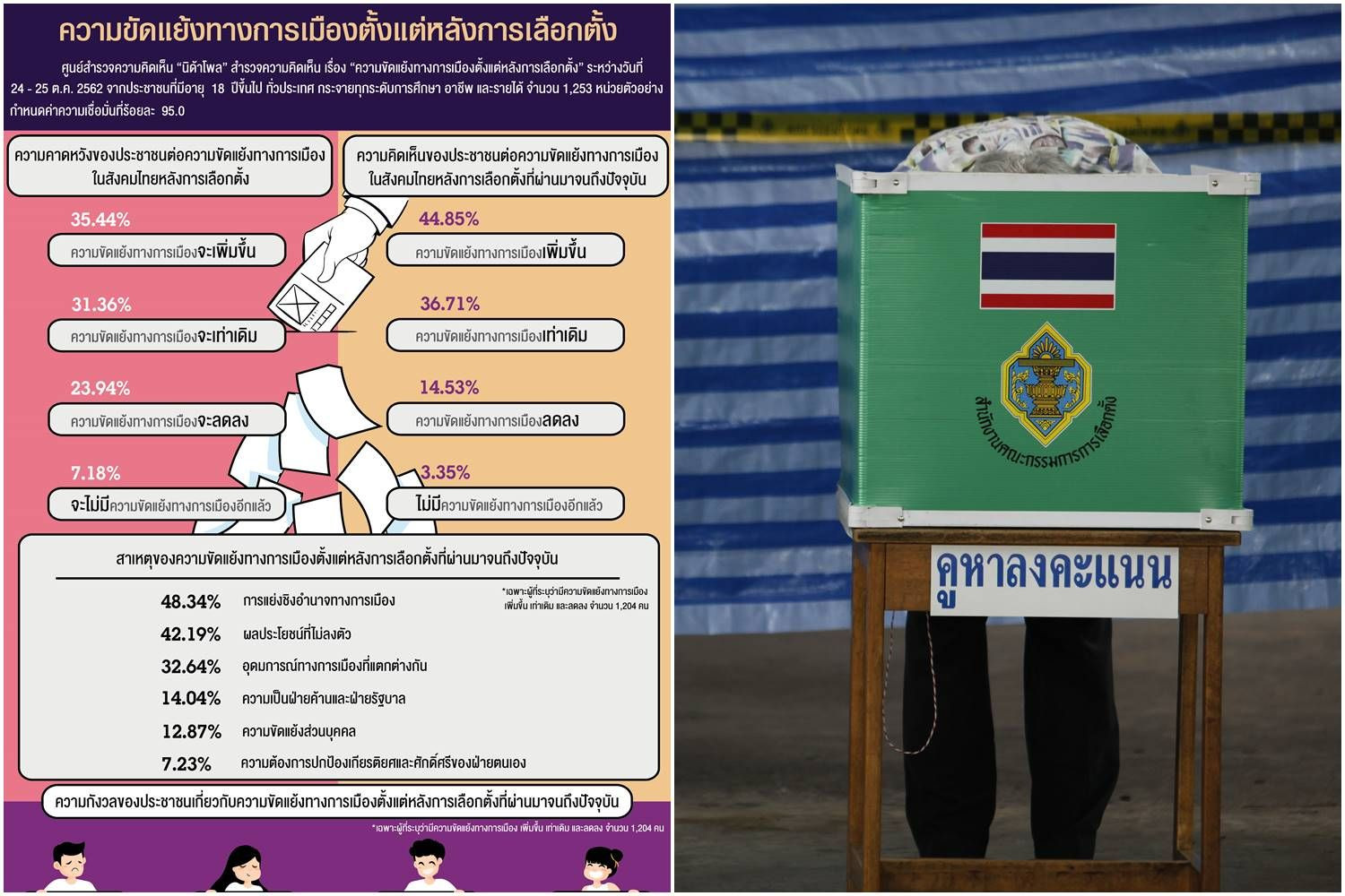 ศูนย์สำรวจความคิดเห็น “นิด้าโพล” สถาบันบัณฑิตพัฒนบริหารศาสตร์ (นิด้า) สำรวจความคิดเห็นของประชาชน เรื่อง “ความขัดแย้งทางการเมืองตั้งแต่หลังการเลือกตั้ง” ทำการสำรวจระหว่างวันที่ 24 – 25 ตุลาคม 2562 จากประชาชนที่มีอายุ 18 ปีขึ้นไป กระจายทุกภูมิภาค ระดับการศึกษา และอาชีพทั่วประเทศ รวมทั้งสิ้น จำนวน 1,253 หน่วยตัวอย่าง เกี่ยวกับความขัดแย้งทางการเมืองตั้งแต่หลังการเลือกตั้ง