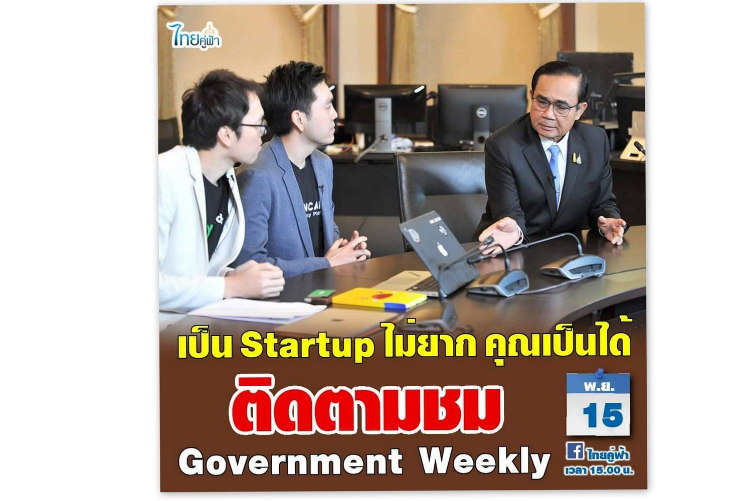 เมื่อวันที่ 15 พ.ย.2562 ในรายการ Government Weekly จัดขึ้นทุกวันศุกร์ เวลา 15.00 น. ผ่านทาง เพจ “ไทยคู่ฟ้า” ในช่วง PM Talk โดย พล.อ.ประยุทธ์ จันทร์โอชา นายกรัฐมนตรี และ รมว.กลาโหม สัปดาห์นี้ร่วมพูดคุยกับคนรุ่นใหม่ที่ทำธุรกิจสตาร์ทอัพจนประสบความสำเร็จมาร่วมแชร์ประสบการณ์และแลกเปลี่ยนแนวทางความร่วมมือและการสนับสนุนธุรกิจสตาร์ทอัพไทยให้เติบโตไปสู่ระดับ “ยูคอร์น” ในอนาคต