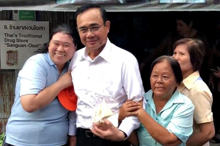 ระหว่างนั้นนายกฯ ได้เข้าไปพูดคุยกับบรรดาแม่ค้าที่นำขนมไทยโบราณในชุมชนมามอบให้ โดยพูดไปพร้อมจับที่ข้อมือแม่ค้าคนหนึ่งซึ่งใส่กำไลทองพร้อมเอามือแม่ค้าลูบที่ท้องนายกฯ แล้วถามว่า เศรษฐกิจพอยังได้อยู่ไหม  มีทองใส่อยู่แสดงว่าเศรษฐกิจยังพอได้นะ ช่วยๆ รัฐบาลอธิบายเดี๋ยวมันก็ได้เองแหละ ขณะเดียวกันยังเดินเข้าไปทักทายผู้สูงอายุถึงในบ้าน ซึ่งนายกฯ ได้ สอบถามเรื่องสุขภาพพร้อมอวยพรขอให้อายุยืน