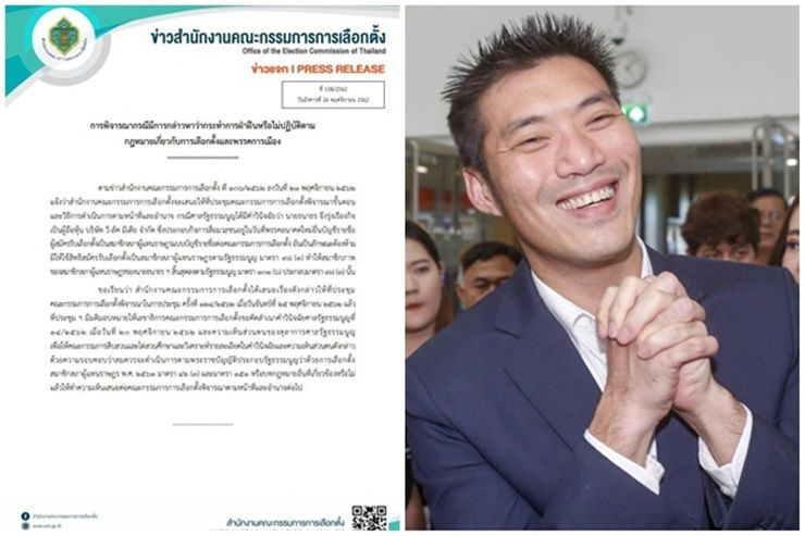 เมื่อวันที่ 26 พ.ย. สำนักงานคณะกรรมการการเลือกตั้ง (กกต.) ออกเอกสารข่าวเรื่องการพิจารณากรณีมีการกล่าวหาว่ากระทำการฝ่าฝืนหรือไม่ปฏิบัติตามกฎหมายเกี่ยวกับการเลือกตั้งและพรรคการเมือง ระบุว่าตามข่าวสำนักงานคณะกรรมการการเลือกตั้งที่ 106/2562 ลงวันที่ 21 พย.62 แจ้งว่าสำนักงานคณะกรรมการการเลือกตั้งจะเสนอให้ที่ประชุมคณะกรรมการการเลือกตั้งพิจารณาขั้นตอนและวิธีการดำเนินการตามหน้าที่และอำนาจ กรณีศาลรัฐธรรมนูญได้มีคำวินิจฉัยว่า นายธนาธร จึงรุ่งเรืองกิจ เป็นผู้ถือหุ้น บริษัท วี-ลัค มีเดีย จำกัด ซึ่งประกอบกิจการสื่อมวลชนอยู่ในวันที่พรรคอนาคตใหม่ยื่นบัญชีรายชื่อผู้สมัครรับเลือกตั้งเป็นสมาชิกสภาผู้แทนราษฎรแบบบัญชีรายชื่อต่อคณะกรรมการการเลือกตั้ง อันเป็นลักษณะต้องห้ามมิให้ใช้สิทธิสมัครรับเลือกตั้งเป็นสมาชิกสภาผู้แทนราษฎรตามรัฐธรรมนูญ มาตรา 98 (3) ทำให้สมาชิกภาพของสมาชิกสภาผู้แทนราษฎรของนายธนาธร ฯ สิ้นสุดลงตามรัฐธรรมนูญ มาตรา 101 (6) ประกอบมาตรา 98 (3) นั้น