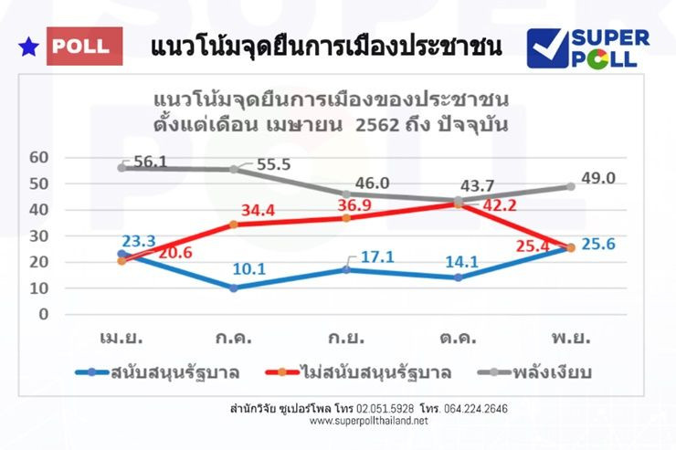 เมื่อวันที่ 30 พ.ย. นายนพดล กรรณิกา ผู้อำนวยการสำนักวิจัยซูเปอร์โพล (SUPER POLL) เปิดเผยผลสำรวจ เรื่อง แนวโน้มจุดยืนการเมืองประชาชน กรณีศึกษาประชาชนทุกสาขาอาชีพทั่วประเทศ จำนวน 1,098 ตัวอย่าง ระหว่างวันที่ 20-30 พฤศจิกายน 2562 พบว่า แนวโน้มฐานสนับสนุนของประชาชนต่อรัฐบาลเริ่มสูงขึ้น หลังจากตกต่ำลงตั้งแต่ช่วงหลังเลือกตั้งเป็นต้นมา คือ ร้อยละ 23.3 ในเดือนเมษายน ร้อยละ 10.1 ในเดือนกรกฎาคม ร้อยละ 17.1 ในเดือนกันยายน ร้อยละ 14.1 ในเดือนตุลาคม และขึ้นมาอยู่ที่ร้อยละ 25.6 ในเดือนพฤศจิกายน โดยสาเหตุหลักมาจากมาตรการชิม ช้อป ใช้ และมาตรการต่าง ๆ ของรัฐบาลในการลดรายจ่ายเพิ่มรายได้ของประชาชน