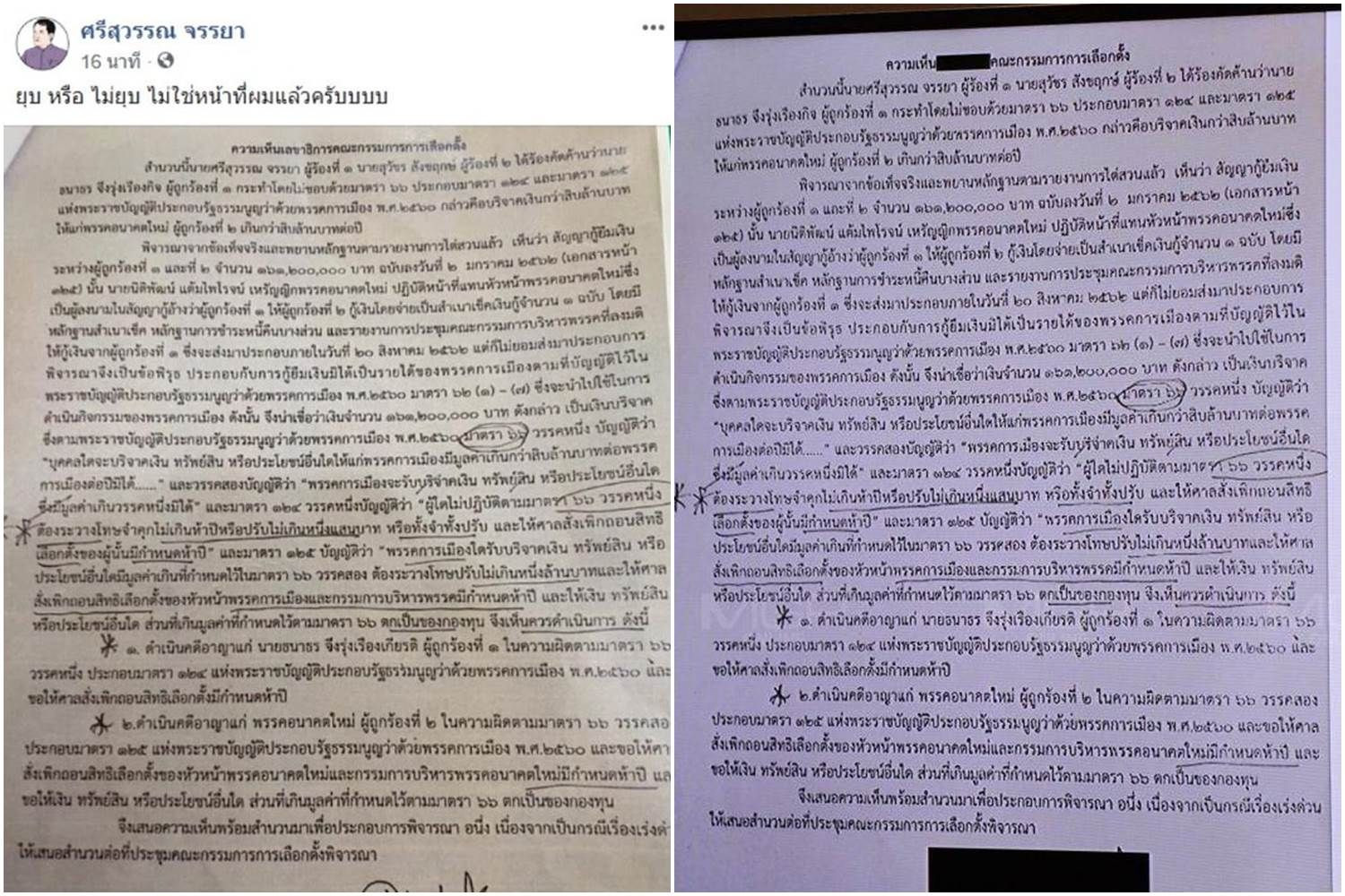 คนแรกคือคุณศรีสุวรรณ จรรยา ที่ระบุตัวตนของหนังสือชัดเจน คือเลขาธิการกกต. ที่ชงเรื่องให้กกต.ใหญ่ ลงวันที่ 20 กันยายน 2562 เรื่องเงินกู้พรรคอนาคตใหม่ ที่กรรมการไต่สวนสอบสวนดำเนินการ เมื่อพิจาณาเสร็จ ก็เสนอความเห็นให้กกต.ใหญ่ ซึ่งเป็นไปตามขั้นตอน