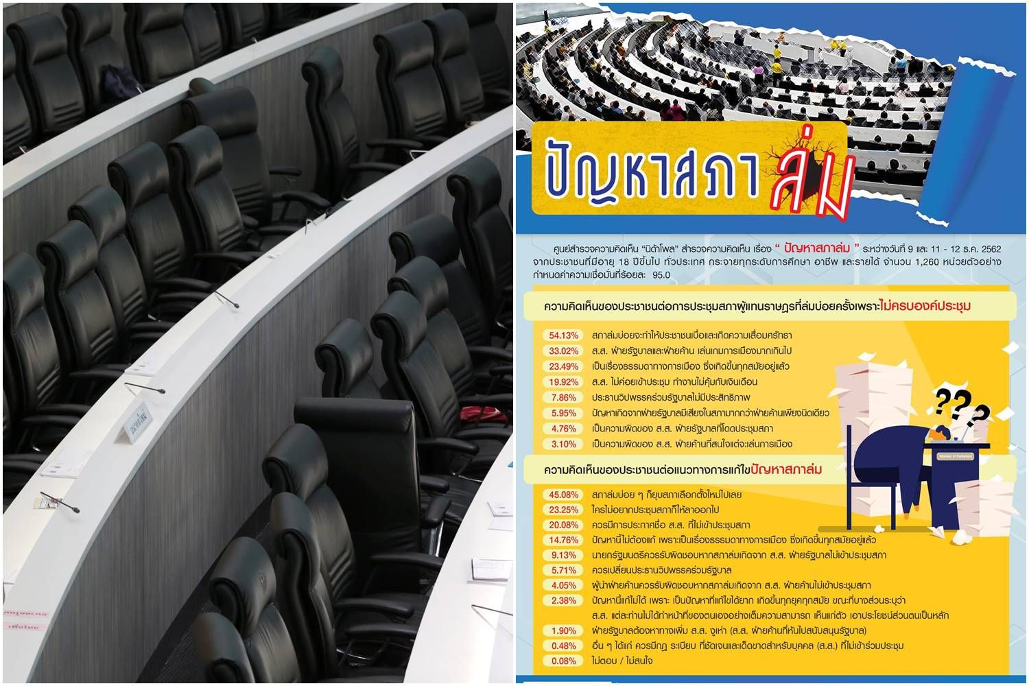 ศูนย์สำรวจความคิดเห็น “นิด้าโพล” สถาบันบัณฑิตพัฒนบริหารศาสตร์ (นิด้า) เปิดเผยผลสำรวจของประชาชน เรื่อง “ปัญหาสภาล่ม” ทำการสำรวจระหว่างวันที่ 9 และ 11 - 12 ธันวาคม 2562 จากประชาชนที่มีอายุ 18 ปีขึ้นไป กระจายทุกภูมิภาค ระดับการศึกษา และอาชีพทั่วประเทศ รวมทั้งสิ้น จำนวน 1,260 หน่วยตัวอย่าง เกี่ยวกับการประชุมสภาผู้แทนราษฎรที่ล่มบ่อยครั้ง การสำรวจอาศัยการสุ่มตัวอย่างโดยใช้ความน่าจะเป็นจากบัญชีรายชื่อฐานข้อมูลตัวอย่างหลัก (Master Sample) ของ “นิด้าโพล” สุ่มตัวอย่างด้วยวิธีแบบง่าย (Simple Random Sampling) เก็บข้อมูล ด้วยวิธีการสัมภาษณ์ทางโทรศัพท์โดยกำหนดค่าความเชื่อมั่นที่ร้อยละ 95.0