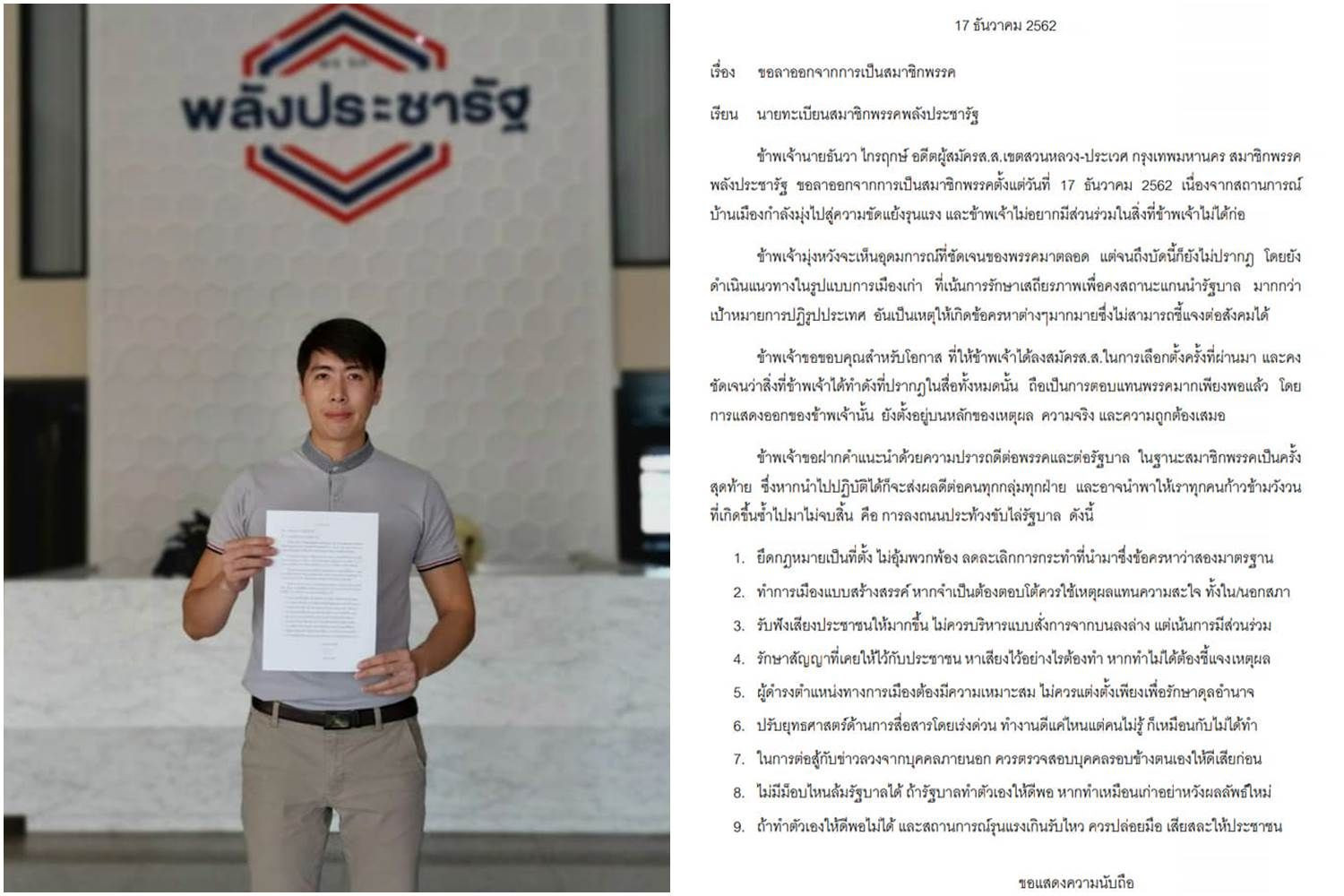 ผมยื่นหนังสือ 'ลาออก' จากพรรคพลังประชารัฐแล้วนะครับ รายละเอียดและเหตุผลดังต่อไปนี้