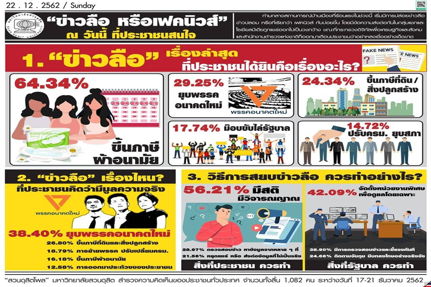 เมื่อวันที่ 22 ธ.ค. 62 สวนดุสิตโพล มหาวิทยาลัยสวนดุสิต เปิดเผยผลสำรวจเรื่อง "ข่าวลือ หรือ เฟคนิวส์ ณ วันนี้ที่ประชาชนสนใจ" โดยสำรวจความคิดเห็นประชาชนทั่วประเทศ จำนวนทั้งสิ้น 1,082 คน ระหว่างวันที่ 17-21 ธ.ค.62 เพื่อสะท้อนความคิดเห็นของประชาชน จากกรณีสถานการณ์บ้านเมืองที่ร้อนแรงในช่วงนี้ เริ่มมีการปล่อยข่าวลือ ข่าวปลอม หรือที่เรียกว่า เฟคนิวส์ กันบ่อยขึ้น โดยมีข้อความส่งต่อกันในกลุ่มแชทและโซเชียลมีเดียถูกแชร์ออกไปเป็นวงกว้าง ขณะที่กระทรวงดิจิทัลเพื่อเศรษฐกิจและสังคมและสำนักงานตำรวจแห่งชาติ ออกมาเตือนประชาชนว่าอย่าหลงเชื่ออย่างเด็ดขาด สรุปผลได้ ดังนี้