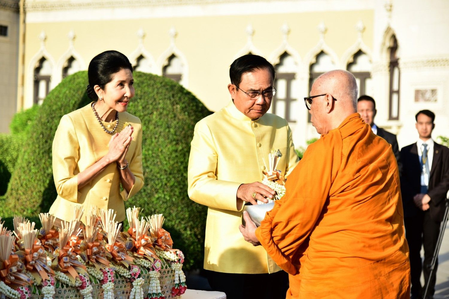 ทั้งนี้ภายหลังตักบาตร?เสร็จ นายกรัฐมนตรี ได้เดินสวัสดีปีใหม่คณะรัฐมนตรีทุกคน พร้อมกล่าวทักทายอย่างอารมณ์?ดี จากนั้นขึ้นไปสักการะพระพรหมบนตึกไทยคู่ฟ้า โดยถวายผลไม้ บนตึกไทยคู่ฟ้า จากนั้นเวลา 09.09 น. ได้ลงมาสักการะศาลพระภูมิ?เจ้าที่ โดยนายกฯได้ถวายอาหารคาวหวาน ประกอบด้วย ไข่ลูกเขย กระเพราเนื้อ ต้มกะทิสายบัว ข้าวสวย ลอดช่องน้ำกะทิ และน้ำแดง ส่วนศาลตายาย นายกฯได้ถวายพะแนงหมู กระเพราเนื้อ ต้มกะทิสายบัว ข้าวสวย สลิ่มน้ำกะทิ น้ำแดง กล้วย อ้อย ข้าวตอกดอกไม้ และหมากพลู