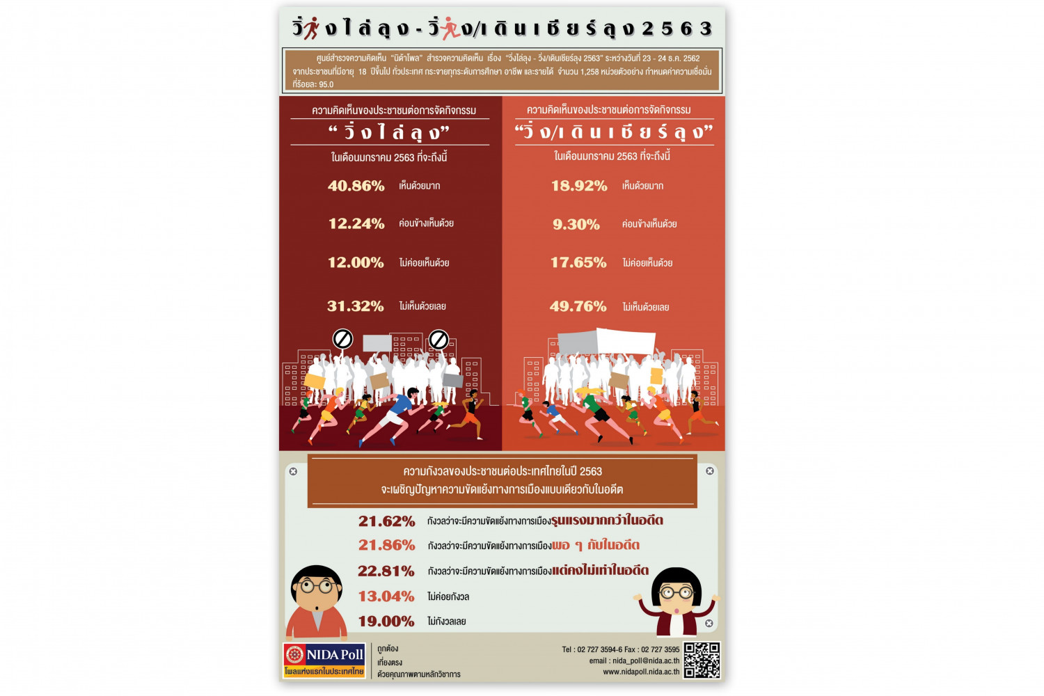 ศูนย์สำรวจความคิดเห็น “นิด้าโพล” สถาบันบัณฑิตพัฒนบริหารศาสตร์ (นิด้า) เปิดเผยผลสำรวจของประชาชน เรื่อง “วิ่งไล่ลุง-วิ่ง/เดินเชียร์ลุง 2563” ทำการสำรวจระหว่างวันที่ 23 – 24 ธันวาคม 2562 จากประชาชนที่มีอายุ 18 ปีขึ้นไป กระจายทุกภูมิภาค ระดับการศึกษา และอาชีพทั่วประเทศ รวมทั้งสิ้น จำนวน 1,258 หน่วยตัวอย่าง เกี่ยวกับการจัดกิจกรรม “วิ่งไล่ลุง-วิ่ง/เดินเชียร์ลุง” ในเดือนมกราคม 2563 ที่จะถึงนี้ การสำรวจอาศัยการสุ่มตัวอย่างโดยใช้ความน่าจะเป็นจากบัญชีรายชื่อฐานข้อมูลตัวอย่างหลัก (Master Sample) ของ “นิด้าโพล” สุ่มตัวอย่างด้วยวิธีแบบง่าย (Simple Random Sampling) เก็บข้อมูลด้วยวิธีการสัมภาษณ์ทางโทรศัพท์ โดยกำหนดค่าความเชื่อมั่นที่ร้อยละ 95.0