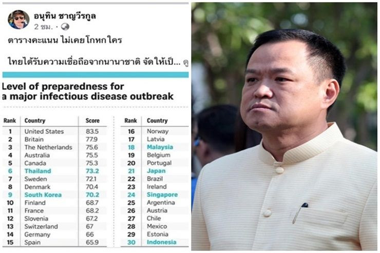 เมื่อวันที่ 29 ม.ค.  นายอนุทิน ชาญวีรกูล รองนายกรัฐมนตรี และรัฐมนตรีว่าการกระทรวงสาธารณสุข ได้โพสต์เฟซบุ๊กแสดงความความมั่นใจต่อการทำงานของเจ้าหน้าที่กระทรวงสาธารณสุข พร้อมแนบรูปภาพ ข้อมูลเพื่อยืนยันว่าประเทศไทย มีความพร้อมในการจัดการโรคระบาดอยู่ในอันดับ 6 ของโลก และข้อมความดังนี้
