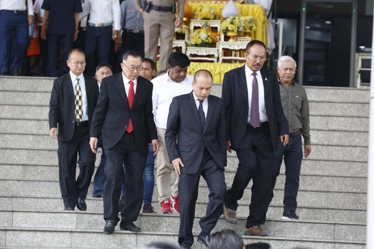 โดยเมื่อเวลา 09.00 น. นายวีระกานต์ มุสิกพงศ์ อดีตประธาน นปช. , นพ.เหวง โตจิราการ แกนนำ นปช. , นายวิภูแถลง พัฒนภูมิไท แกนนำ นปช. , นายณัฐวุฒิ ใสยเกื้อ เลขาธิการ นปช. ทยอยเดินทางมาศาล ขณะที่ นายจตุพร พรหมพันธุ์ ประธาน นปช. , นายก่อแก้ว พิกุลทอง และนายยศวริศ ชูกล่อม หรือเจ๋ง ดอกจิก แกนนำ นปช. , นางธิดา ถาวรเศรษฐ อดีต ประธาน นปช. พร้อมด้วยภรรยาของนายณัฐวุฒิ ก็มาให้กำลังใจด้วย พร้อมวลชนจำนวน 60-70 เดินทางมาให้กำลังใจด้วยเกือบเต็มห้องพิจารณา 704 ที่เป็นห้องขนาดมหญ่รองรับได้กว่า 100 คน อย่างไรก็ดีสำหรับนายจตุพร ก็ถูกฟ้องคดีนี้แยกสำนวนเป็นอีกคดีหนึ่งด้วยโดยคดีรอพิจารณา