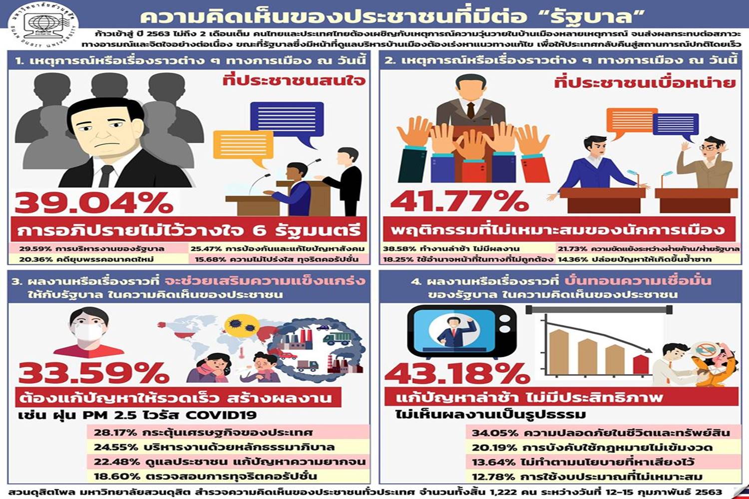 สวนดุสิตโพล มหาวิทยาลัยสวนดุสิต เปิดเผยผลสำรวจความคิดเห็นของประชาชน เรื่อง "ความคิดเห็นของประชาชนที่มีต่อรัฐบาล" โดยสำรวจความคิดเห็นประชาชนทั่วประเทศ จำนวนทั้งสิ้น 1,222 คน ระหว่างวันที่ 12-15 กุมภาพันธ์ 2563 เพื่อสะท้อนความคิดเห็นของประชาชนจากกรณีก้าวเข้าสู่ ปี 2563 ไม่ถึง 2 เดือนเต็ม คนไทยและประเทศไทยต้องเผชิญกับเหตุการณ์ความวุ่นวายในบ้านเมืองหลายเหตุการณ์ จนส่งผลกระทบต่อสภาวะทางอารมณ์และจิตใจอย่างต่อเนื่อง ขณะที่รัฐบาลซึ่งมีหน้าที่ดูแลบริหารบ้านเมืองต้องเร่งหาแนวทางแก้ไข เพื่อให้ประเทศกลับคืนสู่สถานการณ์ปกติโดยเร็ว สรุปผลได้ ดังนี้