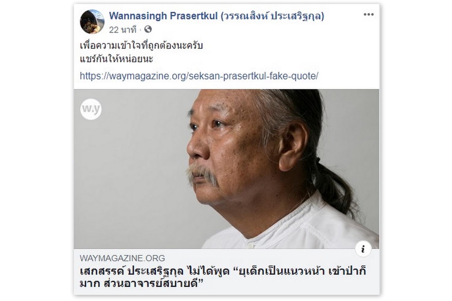 สำหรับในเนื้อหาของโพสต์ที่ปรากฎบนเฟซบุ๊กของนายวรรณสิงห์ อ้างถึง https://waymagazine.org/seksan-prasertkul-fake-quote/ ซึ่งพาดหัวว่า เสกสรรค์ ประเสริฐกุล ไม่ได้พูด “ยุเด็กเป็นแนวหน้า เข้าป่าก็มาก ส่วนอาจารย์สบายดี”