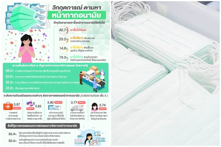 กรุงเทพโพลล์ เผย ประชาชนร้อยละ 42.7 ระบุ หาซื้อหน้ากากอนามัยไม่ได้ ขณะที่ ร้อยละ 58.0 มองการจัดการของภาครัฐอาจทำให้เกิดการกักตุน เอื้อประโยชน์ และ ร้อยละ 56.4 แนะรัฐบาลเปลี่ยนให้ผู้มีความรู้ความสามารถมาบริหารจัดการแทน