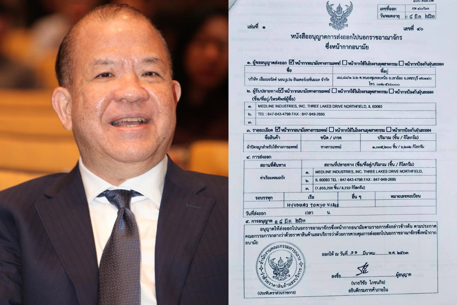 นายพิชัย นริพทะพันธุ์ อดีตทีมเศรษฐกิจพรรคเพื่อไทย โพสต์ภาพพร้อมข้อความผ่าน เฟซบุ๊ก Pichai Naripthaphan โดยระบุข้อความว่า หลุดออกมาแล้ว! ใบอนุญาตส่งออกหน้ากากอนามัยใบแรก ตามที่เรียกร้อง คราวนี้ก็รู้แล้วว่าทำไมจึงต้องฟ้องแก้เกี้ยว !!!! ถ้าใครหาได้อีก ช่วยกันส่งมาแฉหน่อย #หน้ากากอนามัยหายไปไหน #รัฐบาลส้น.. ในภาพหนังสืออนุญาตส่งออกไปนอกราชอาณาจักร ซึ่งหน้ากากอนามัย ในหนังสือฉบับดังกล่าว เป็นการอนุญาตส่งออกหน้ากากอนามัยทางการแพทย์ จำนวน 1,035,200 ชิ้น น้ำหนัก 6,232 กิโลกรัม ไปยังบริษัทแห่งหนึ่ง ซึ่งมีที่ตั้งอยู่ในรัฐอิลลินอยส์ สหรัฐอเมริกา โดยหนังสือดังกล่าวประทับตรา สำนักงานคณะกรรมการกลาง ว่าด้วยราคาสินค้าและบริการ ลงนามโดย นายวิชัย โภชนกิจ อธิบดีกรมการค้าภายใน เมื่อวันที่ 11 มีนาคม 2563