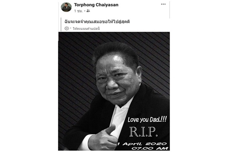 เมื่อวันที่ 1 เม.ย. นายต่อพงษ์ ไชยสาส์น อดีตรัฐมนตรีช่วยว่าการกระทรวงสาธารณสุข และอดีตส.ส.อุดรธานี โพสต์ภาพแจ้งข่าวการเสียชีวิตของ บิดา คือ นายประจวบ ไชยสาส์น อดีตรัฐมนตรีหลายกระทรวง