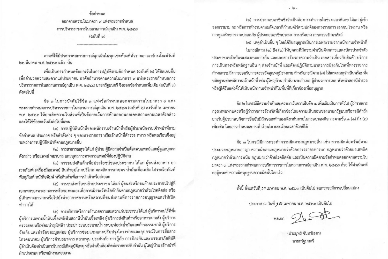 เมื่อวันที่ 10เม.ย.63 พล.อ.ประยุทธ์ จันทร์โอชา นายกรัฐมนตรีและรมว.กลาโหม ลงนามออกข้อกำหนดตามความในมาตรา 9 แห่ง พ.ร.ก.ฉุกเฉิน ฉบับที่ 3 ระบุว่า ตามที่ได้มีประกาศสถานการณ์ฉุกเฉินทั่วราชอาณาจักรตั้งแต่วันที่ 26 มี.ค. พ.ศ.2563 แล้วนั้น เพื่อเป็นการกำหนดข้อยกเว้นในการปฏิบัติตามข้อกำหนด (ฉบับที่ 2) ให้ชัดเจนขึ้น เพื่ออำนวยความสะดวกแก่ประชาชน อาศัยอำนาจตามมาตร 9 ของพ.ร.ก.ฉุกเฉิน นายกฯจึงออกข้อกำหนดเพิ่มเติม (ฉบับที่ 3) ดังต่อไปนี้