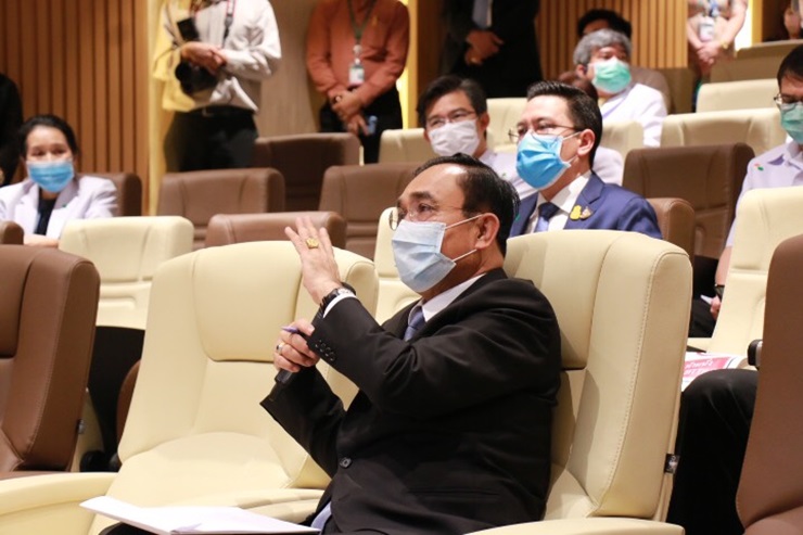 โอกาสนี้ นายกฯพูดคุยสอบถามแพทย์ พยาบาล และเจ้าหน้าที่ ในการปฏิบัติงานและให้กำลังใจทุกคนว่า ตนชื่นชมหมอทุกคน ตนคุ้นเคยกับที่นี่ เพราะพ่อแม่ก็รักษาที่นี่ รวมถึงตนได้มาอารักขาเมื่อครั้งที่พระบาทสมเด็จพระเจ้าอยู่หัว รัชกาลที่ 9 ทรงมาประทับที่นี่และในหลายๆโอกาส ชื่นชมมาโดยตลอดและเป็นที่เชื่อมั่นศรัทธาของประชาชน ซึ่งสิ่งที่เราทำวันนี้ถือว่าทำถวายพระบาทสมเด็จพระเจ้าอยู่หัวรัชกาลที่ 9 และพระบาทสมเด็จพระเจ้าอยู่หัวรัชกาลที่ 10 พระองค์ท่านทรงฝากกำลังใจมาถึงพวกเราทุกคน ชื่นชมในการทำงานที่มีความก้าวหน้าในทางที่ดีขึ้น ตนถวายรายงานพระองค์ท่านทุกวัน โดยส่งข้อสรุปทั้งจากกระทรวงสาธารณสุข จากการแถลงศูนย์โควิด-19 ขึ้นไปทุกวัน พระองค์ท่านรับสั่งว่าหากมีสิ่งหนึ่งสิ่งใดที่พระองค์ทรงช่วยได้ขอให้บอกมา