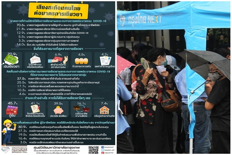 กรุงเทพโพลล์โดยศูนย์วิจัยมหาวิทยาลัยกรุงเทพ ดำเนินการสำรวจความคิดเห็นประชาชน เรื่อง “เสียงสะท้อนคนไทยต่อมาตรการเยียวยา” โดยเก็บข้อมูลกับประชาชนจากทุกภูมิภาคทั่วประเทศจำนวน 1,402 คน พบว่า
