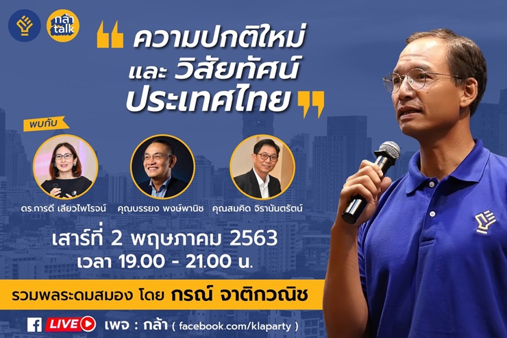 เมื่อวันที่ 2 พ.ค. นายกรณ์ จาติกวณิช หัวหน้าพรรคกล้า โพสต์เฟซบุ๊กส่วนตัว เชิญชวนประชาชนผู้สนใจ ฟังไลฟ์สดบนเพจกล้า คืนนี้ (2 พ.ค) 19.00 น. ในโจทย์หลักของประเทศเวลานี้คือ ชีวิตหลังโควิด อะไรจะเปลี่ยน อะไรต้องเปลี่ยน และคนไทยจะปรับตัวอย่างไร
