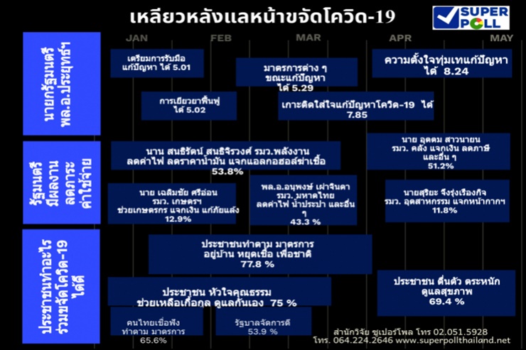 เมื่อวันที่ 2 พ.ค. นายนพดล กรรณิกา ผู้อำนวยการสำนักวิจัยซูเปอร์โพล (SUPER POLL) ร่วมกับ ดร.พนม สีหาบุตร ผู้อำนวยการศูนย์วิจัยยุทธศาสตร์ สถาบันวิจัยความสุขชุมชนและความเป็นผู้นำ เปิดเผยผลสำรวจภาคสนาม เรื่อง เหลียวหลังแลหน้าขจัดโควิด-19 กรณีศึกษาประชาชนทุกสาขาอาชีพทั่วประเทศ โดยดำเนินการเก็บข้อมูลแบบผสมผสาน (Mixed Method) ทั้งการสัมภาษณ์ทางโทรศัพท์ การลงพื้นที่ และการเก็บข้อมูลในโลกโซเชียลทั้งการวิจัยเชิงปริมาณ (Quantitative Research) และการวิจัยเชิงคุณภาพ (Qualitative Research) จำนวน 1,126 ตัวอย่าง ดำเนินโครงการระหว่างวันที่ 25 เมษายน – 1 พฤษภาคม พ.ศ. 2563 ที่ผ่านมา