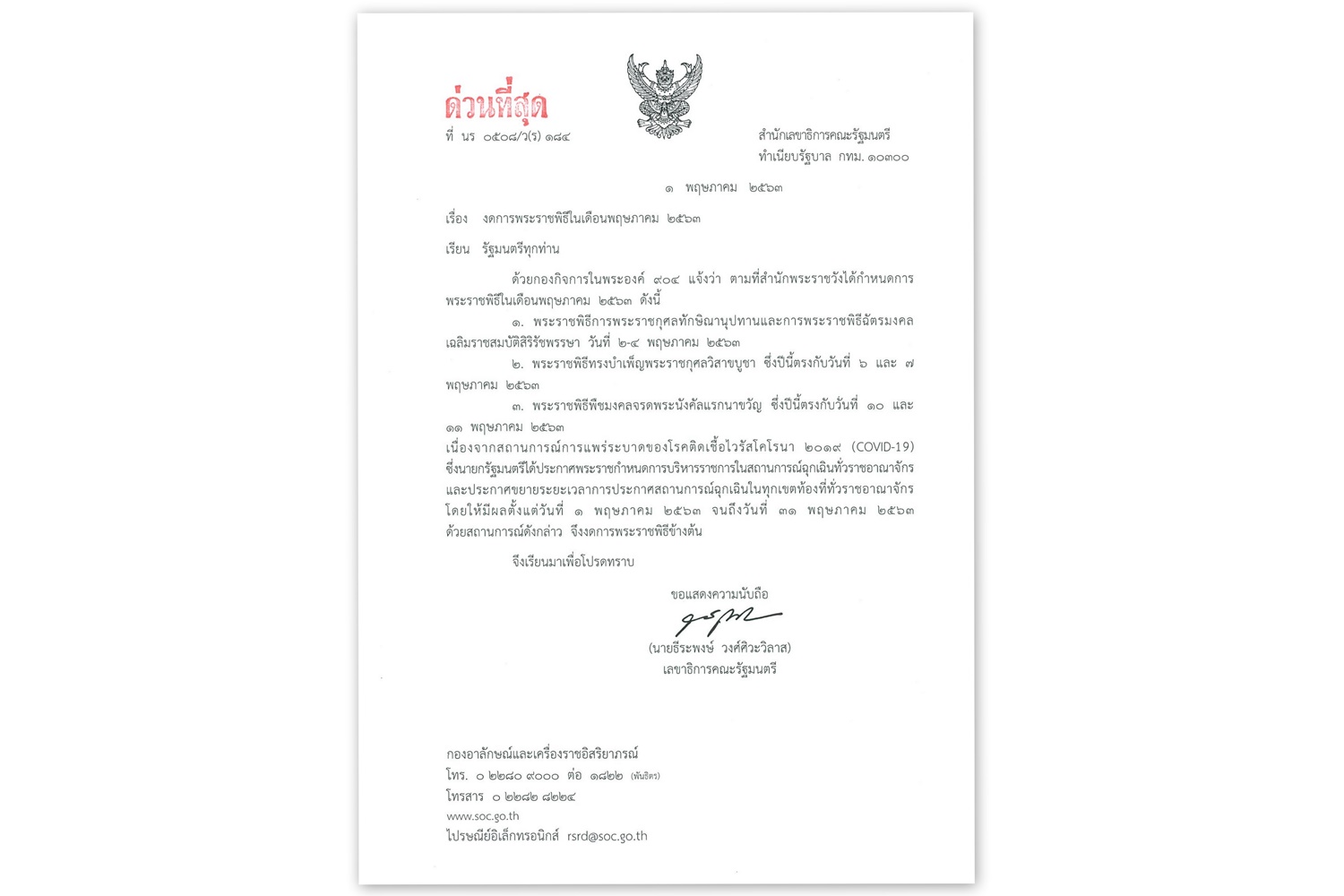 เลขาธิการคณะรัฐมนตรี แจ้งรัฐมนตรีงดการพระราชพิธีสำคัญ3งาน ช่วงพ.ค.63 หลังพ.ร.ก.ฉุกเฉินฯขยายเวลาคุมโควิด-19 ระบาด