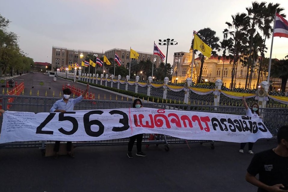 เฟซบุ๊ก สหภาพนักเรียน นิสิต นักศึกษาแห่งประเทศไทย - Student Union of Thailand รายงานเหตุการณ์ กลุ่มนักศึกษาไปรวมตัวถือป้ายผ้า 6ปี รัฐประหารที่ทำเนีบรัฐบาล ป้ายผ้ามีข้อความระบุว่า "2563 เผด็จการ ครองเมือง" พร้อมกับชู3นิ้วแสดงเชิงสัญลักษณ์