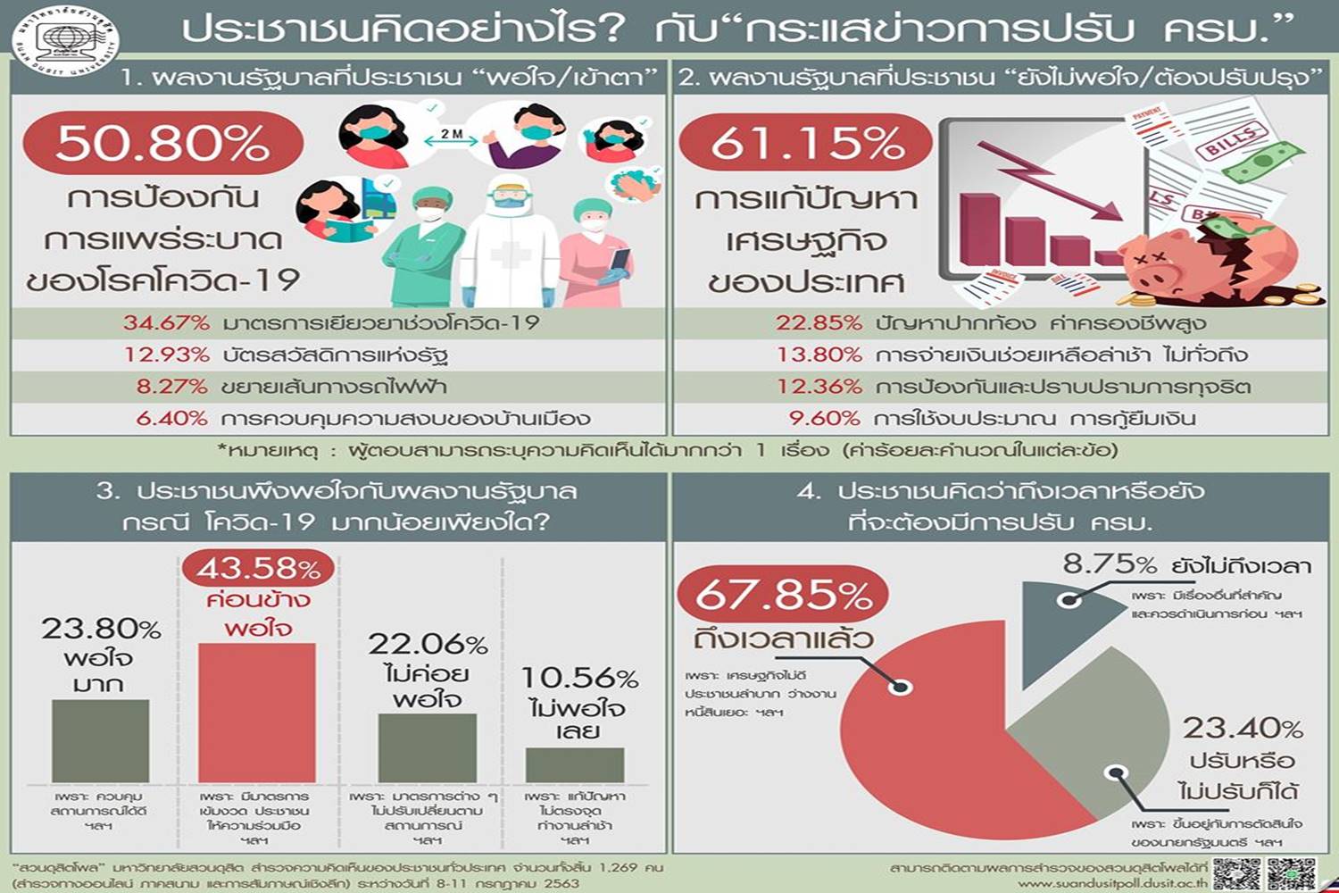 “สวนดุสิตโพล” มหาวิทยาลัยสวนดุสิต เปิดเผยผลสำรวจความคิดเห็นของประชาชนทั่วประเทศ จำนวนทั้งสิ้น 1,269 คน ระหว่างวันที่ 8-11 กรกฎาคม 2563 หัวข้อ “ประชาชนคิดอย่างไร? กับกระแสข่าวการปรับ ครม.” เพื่อสะท้อนความคิดเห็นของประชาชนต่อกรณีกระแสข่าวการปรับ ครม. ภายใต้การนำของ พล.อ.ประยุทธ์ จันทร์โอชา ที่กำลังเป็นประเด็นร้อนที่ถูกพูดถึงอย่างมาก โดยเมื่อวันที่ 10 กรกฎาคมที่ผ่านมา เป็นวันครบรอบ 1 ปีของ “รัฐบาลประยุทธ์ 2” ทำให้หลายคนมองว่าอาจถึงเวลาที่จะต้องปรับเปลี่ยนการบริหารงานของรัฐบาลเพื่อให้มีประสิทธิภาพมากยิ่งขึ้น สรุปผลได้ ดังนี้