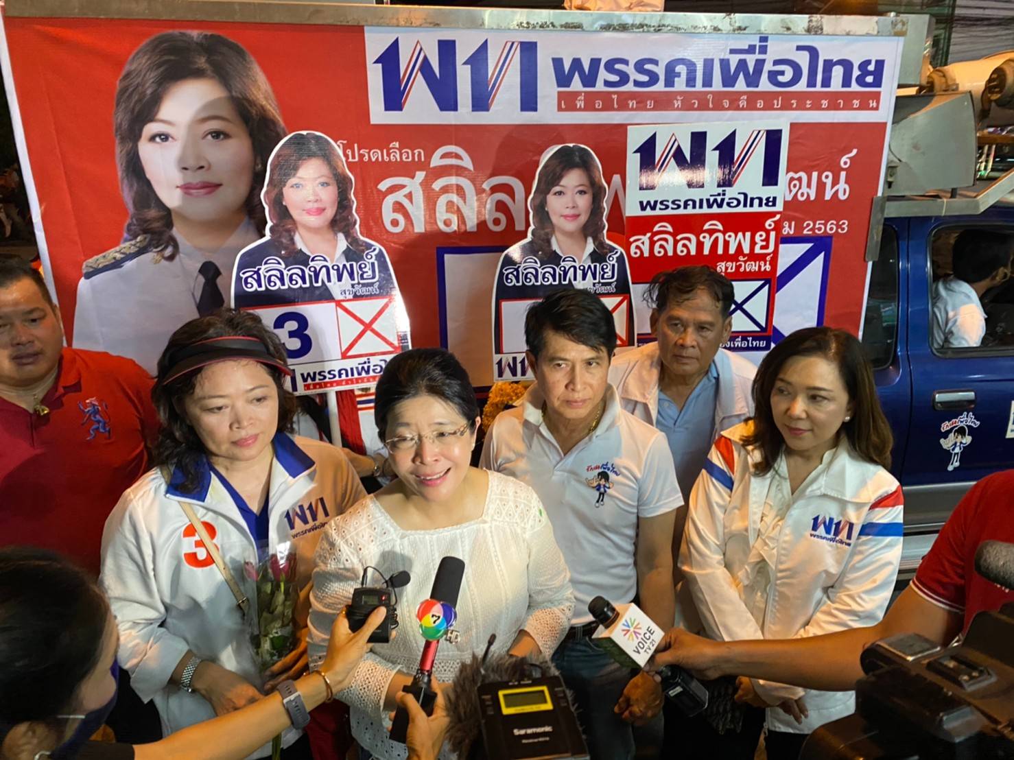 เมื่อวันที่ 19 ก.ค.แกนนำพรรคเพื่อไทย(พท.) นำโดยคุณหญิงสุดารัตน์ เกยุราพันธุ์ ประธานยุทธศาสตร์พรรค, นายวิชาญ มีนชัยนันท์ รองหัวหน้าพรรค, น.อ.อนุดิษฐ์ นาครทรรพ เลขาธิการพรรค และ นายอนุสรณ์ เอี่ยมสะอาด โฆษกพรรค พร้อมคณะทำงานลงพื้นที่ช่วยนางสลิลทิพย์ สุขวัฒน์ ผู้สมัคร ส.ส.เบอร์ 3 ของพรรคหาเสียงเลือกตั้งซ่อม ส.ส.สมุทรปราการ เขต 5 ครอบคลุมเขตพื้นที่ อ.บางบ่อ, บางเสาธง และบางพลีเฉพาะตำบลหนองปรือกับตำบลราชาเทวะ โดยมีผู้สนับสนุน ให้การตอบรับอย่างอบอุ่น พร้อมให้กำลังใจและอวยพรให้ชนะการเลือกตั้งซ่อมครั้งนี้