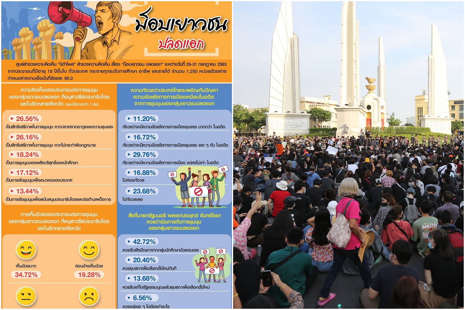 ด้านการเห็นด้วยของประชาชนต่อการชุมนุมของกลุ่มเยาวชนปลดแอก ที่อนุสาวรีย์ประชาธิปไตยและในอีกหลายจังหวัด พบว่า ร้อยละ 34.72 ระบุว่า เห็นด้วยมาก เพราะ เป็นสิทธิเสรีภาพในการแสดงออกการชุมนุมของกลุ่มเยาวชน และอยากเห็นการเปลี่ยนแปลงของบ้านเมือง ไปในทางที่ดีขึ้นกว่านี้ ร้อยละ 19.28 ระบุว่า ค่อนข้างเห็นด้วย เพราะ เป็นสิทธิของกลุ่มเยาวชนที่จะเรียกร้องความถูกต้อง และอยากให้มีความเป็นประชาธิปไตยมากกว่านี้