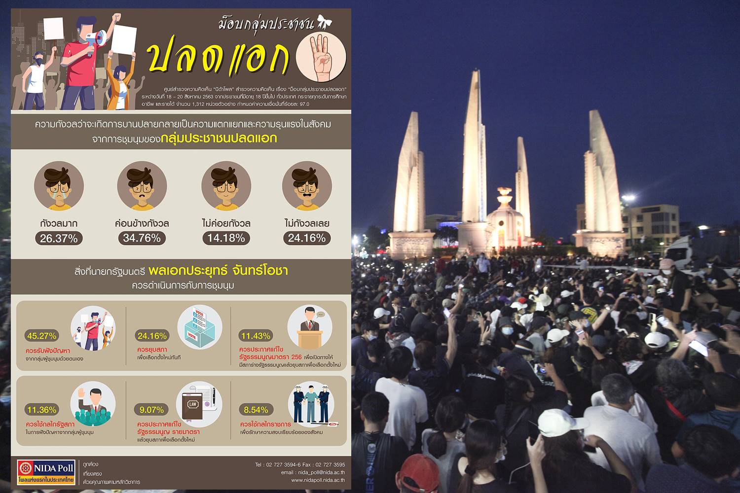 ศูนย์สำรวจความคิดเห็น “นิด้าโพล” สถาบันบัณฑิตพัฒนบริหารศาสตร์ (นิด้า) เปิดเผยผลสำรวจของประชาชน เรื่อง “ม็อบกลุ่มประชาชนปลดแอก” ทำการสำรวจระหว่างวันที่ 18 – 20 สิงหาคม 2563 จากประชาชนที่มีอายุ 18 ปีขึ้นไป กระจายทุกภูมิภาค ระดับการศึกษา และอาชีพ ทั่วประเทศ รวมทั้งสิ้น จำนวน 1,312 หน่วยตัวอย่าง เกี่ยวกับการชุมนุม เมื่อวันที่ 10 สิงหาคม ที่มหาวิทยาลัยธรรมศาสตร์ ศูนย์รังสิต และวันที่ 16 สิงหาคม ที่อนุสาวรีย์ประชาธิปไตย