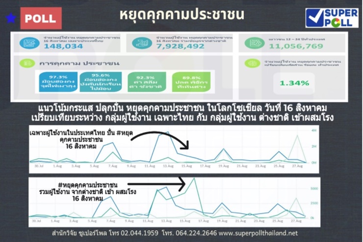 ผู้ช่วยศาสตราจารย์ ดร.นพดล กล่าวด้วยว่า ผลการสำรวจ “เสียงประชาชนในโลกโซเชียล” (Social Media Voice) ผ่านระบบ Net Super Poll ในการศึกษาแนวโน้มความเคลื่อนไหว “หยุดคุกคามประชาชน” ในโลกโซเชียล ซึ่งพบข้อมูลที่น่าพิจารณาคือ จำนวนผู้ใช้โซเชียลเฉพาะประเทศไทยอย่างเดียวการเคลื่อนไหวของผู้ใช้งานในวันม็อบ 16 สิงหาคม จำนวน 148,034 ผู้ใช้งานเฉพาะภายในประเทศไทย แต่ ถ้านำข้อมูลรวมจากต่างชาติเข้ามาวิเคราะห์ด้วยมีถึงจำนวน 7,928,492 ผู้ใช้งาน