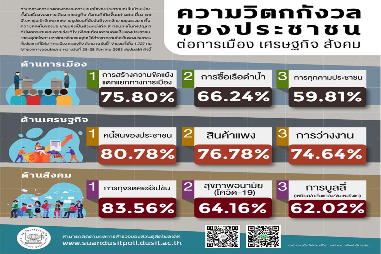 น.ส.พรพรรณ บัวทอง นักวิจัยสวนดุสิตโพล มหาวิทยาลัยสวนดุสิต กล่าวว่า จากสถานการณ์ความขัดแย้งทางการเมืองทั้งในและนอกสภา ส่งผลให้ประชาชนเกิดความวิตกกังวลเรื่องการเมืองถึง 75.80% ยิ่งในช่วงสัปดาห์ที่ผ่าน มากระแสการอนุมัติซื้อเรือดำน้ำท่ามกลางปัญหาเศรษฐกิจที่ GDP ติดลบจนกระทบต่อปากท้องของประชาชน ยิ่งทำให้ประชาชนกังวลมากขึ้น ต้องการให้รัฐบาลรับฟังและแก้ปัญหาปากท้องของประชาชนก่อน เพราะคนกังวลเรื่องหนี้สิน 80.78% สินค้าแพง 76.78% การว่างงาน 74.64% และในด้านสังคม ประชาชนกังวลเรื่องการทุจริตถึง 83.56% ซึ่งกังวลมากกว่าเรื่องโควิด-19 เกือบ 20%