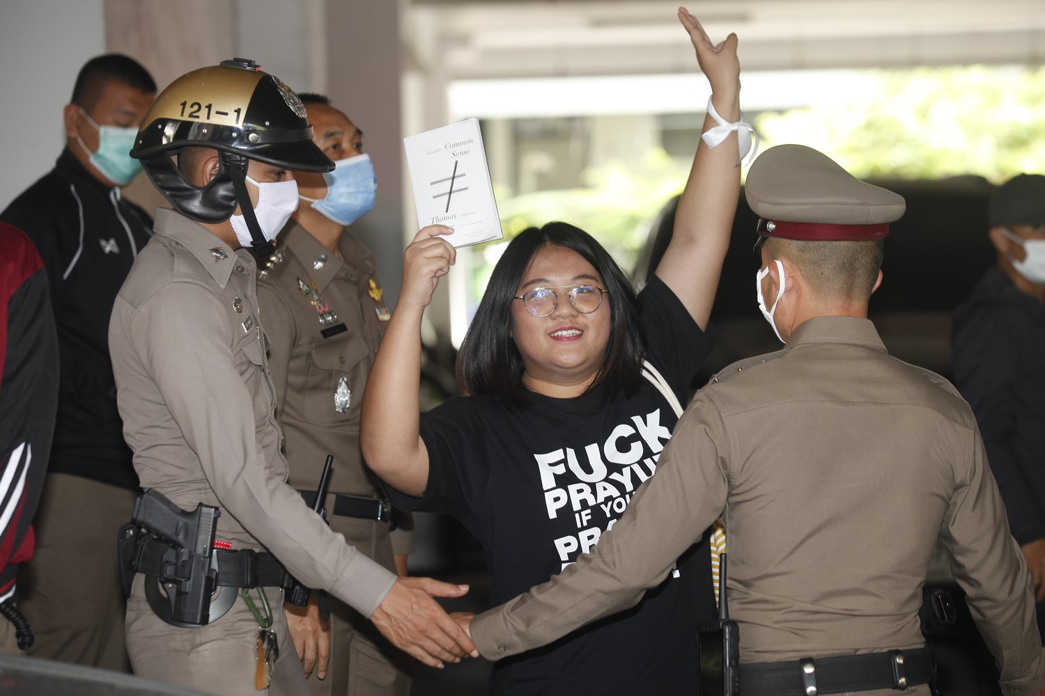 อย่างไรก็ตาม น.ส.จุฑาทิพย์ ได้ชู 3 นิ้ว และชูหนังสือ Common sense หรือสามัญสำนึก ขณะถูกนำตัวขึ้นรถเพื่อส่งตัวไปที่ ศาลอาญา รัชดา เพื่อขออำนาจศาลฝากขัง