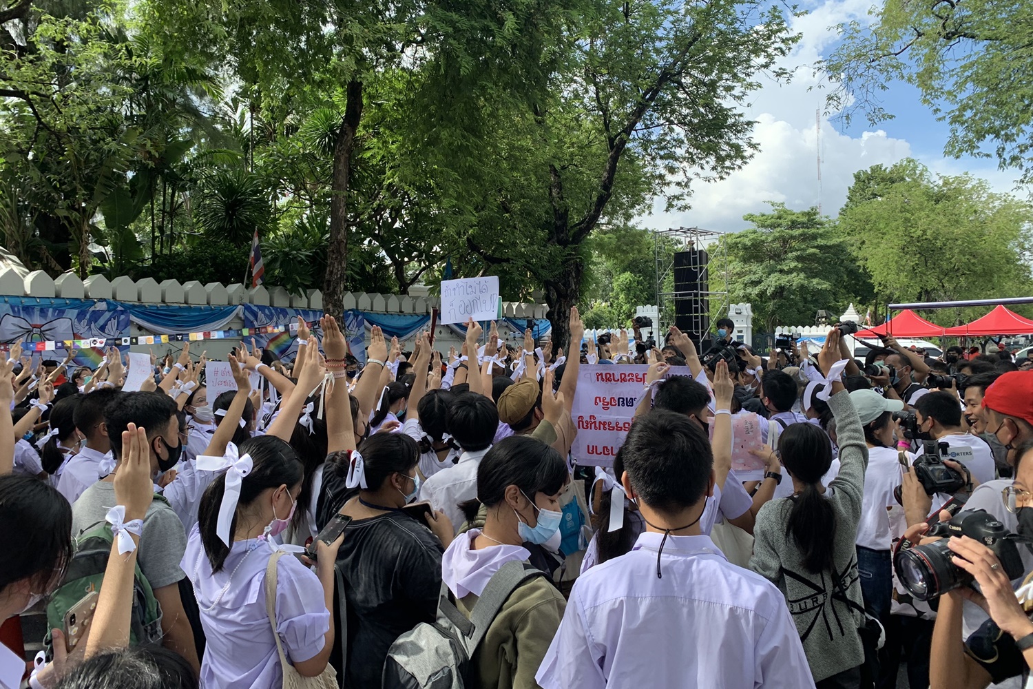 ม็อบนักเรียนเลว บุกกระทรวงศึกษาธิการ ผูกโบว์ขาว ชูสามนิ้ว วางพวงหรีดข้างกำแพง เป่านกหวีดขับไล่ รัฐมนตรีณัฏฐพล