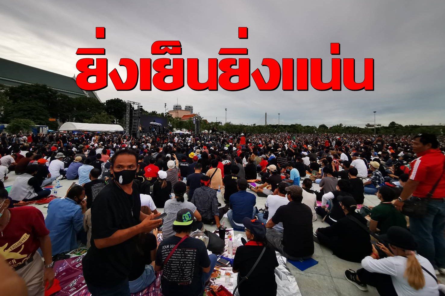 บรรยากาศการชุมนุมช่วงเย็น บรรดาแนวร่วมกลุ่มธรรมศาสตร์และการชุมนุมทยอยขึ้นปราศรัยบนเวทีที่สนามหลวง ขณะที่ผู้ชุมนุมร่วมคึกคัก