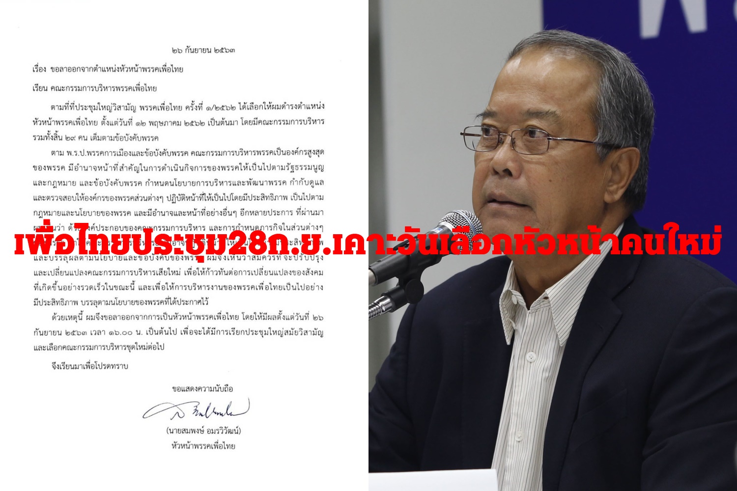 พท.ประชุมกก.บห.ด่วน28ก.ย.นี้เคาะวันเลือกหัวหน้าพรรคคนใหม่หลัง"สมพงษ์-หญิงหน่อย"ลาออก