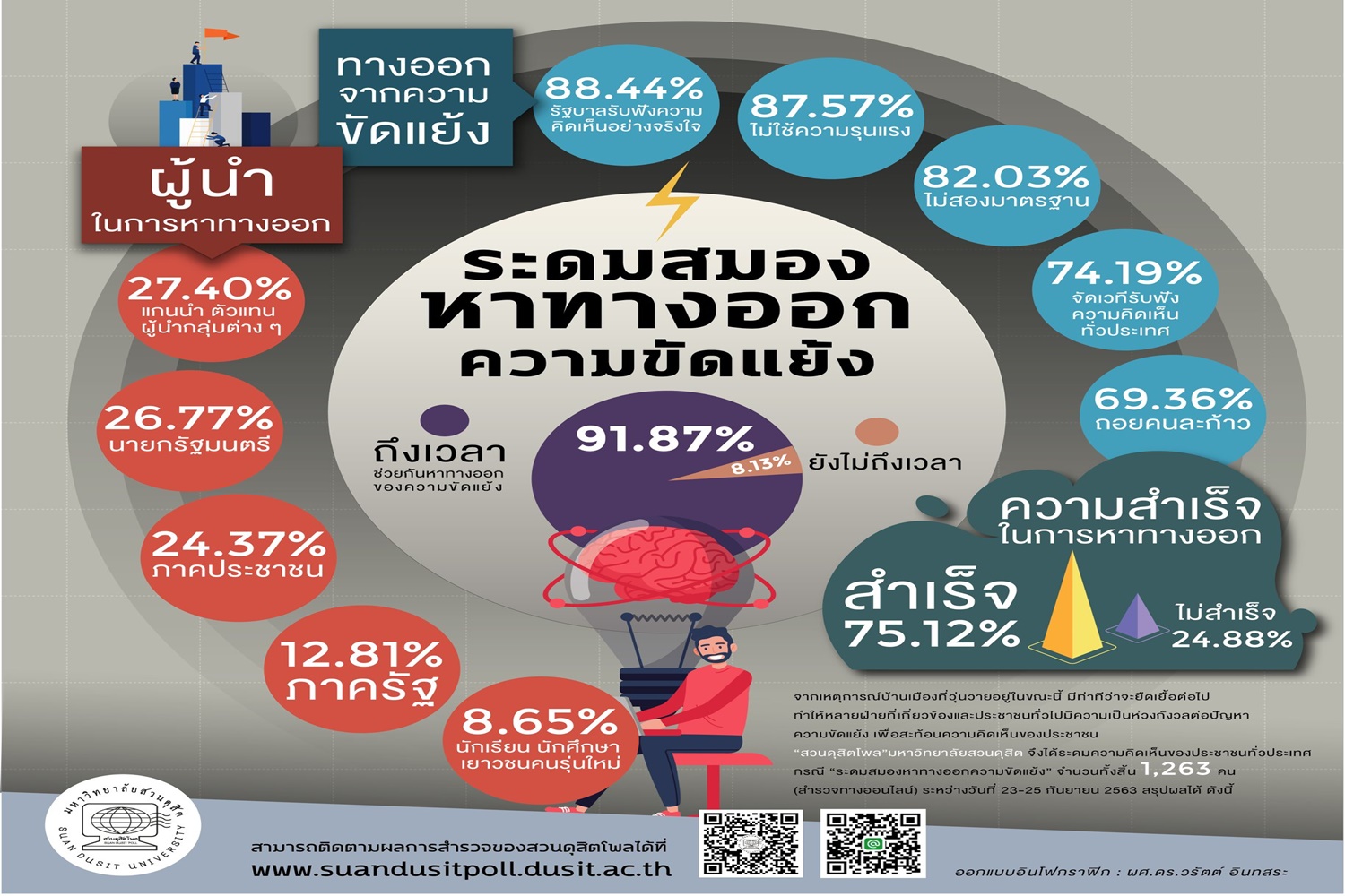 สวนดุสิตโพล มหาวิทยาลัยสวนดุสิต เปิดเผยผลสำรวจเรื่อง "ระดมสมองหาทางออกความขัดแย้ง" โดยสำรวจความคิดเห็นของประชาชนทั่วประเทศจำนวนทั้งสิ้น 1,263 คน ระหว่างวันที่ 23-25 ก.ย.63 เกี่ยวกับเหตุการณ์บ้านเมืองที่วุ่นวายอยู่ในขณะนี้ที่มีแนวโน้มจะยืดเยื้อต่อไป สรุปผลได้ดังนี้