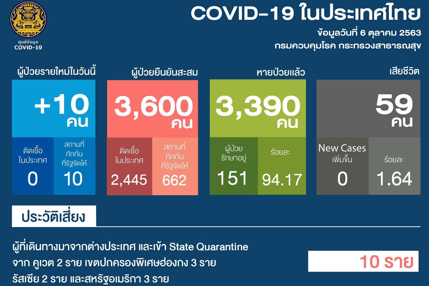 เมื่อวันที่ 6 ต.ค. 63 ศูนย์บริหารสถานการณ์โควิด-19 (ศบค.) รายงานสถานการณ์การแพร่ระบาดของไวรัสโควิด-19 ในประเทศประจำวันดังนี้