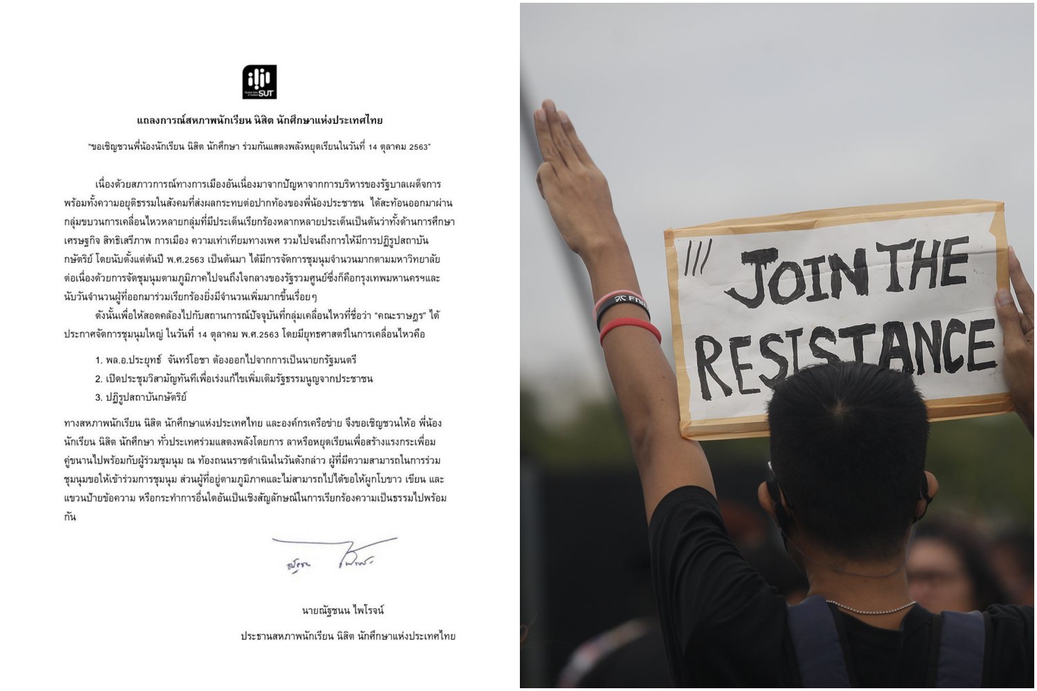 สหภาพนักเรียน นิสิต นักศึกษาแห่งประเทศไทย ได้ออกแถลงการณ์เรื่อง “ขอเชิญชวนพี่น้องนักเรียนนิสิตนักศึกษาร่วมแสดงพลังหยุดเรียนในวันที่ 14 ตุลาคม 2563” โดยเชิญชวนให้ นักเรียน นิสิต นักศึกษาทั่วประเทศ ร่วมแสดงพลังโดยการ ลาหรือหยุดเรียนเพื่อสร้างแรงกระเพื่อมคู่ขนานไปพร้อมกับ ผู้ร่วมชุมนุมในนามกลุ่มคณะราษฎรในวันที่ 14 ต.ค. 63 ที่ถนนราชดำเนิน