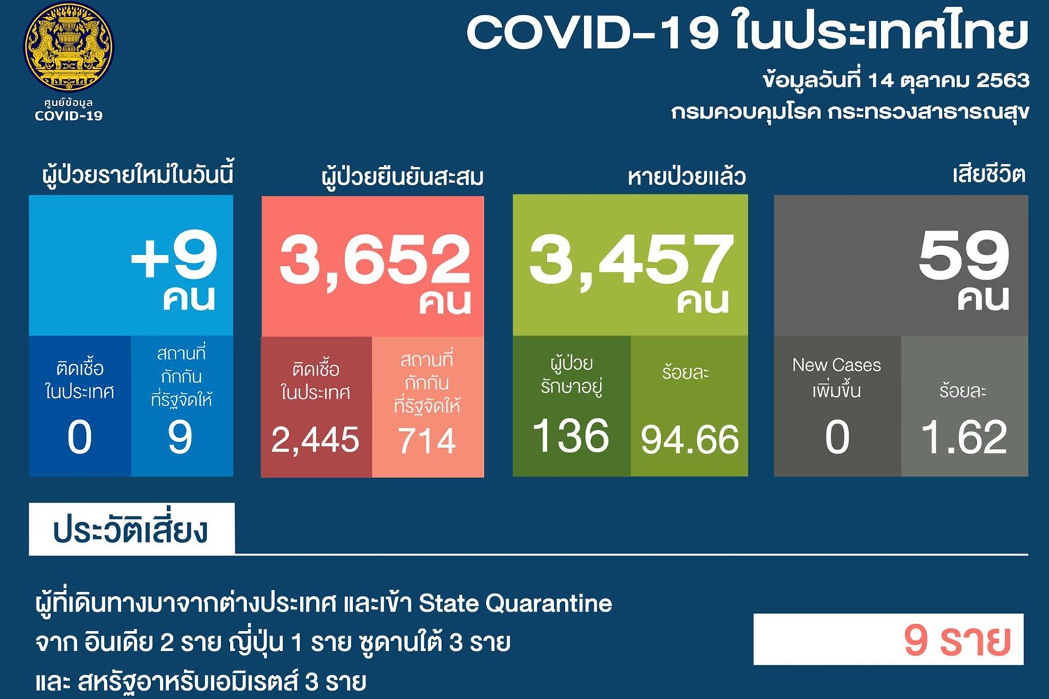เมื่อวันที่ 14 ต.ค. 63 ศูนย์บริหารสถานการณ์โควิด-19 (ศบค.) รายงานสถานการณ์การแพร่ระบาดของไวรัสโควิด-19 ในประเทศประจำวัน โดยมีเนื้อหาดังนี้