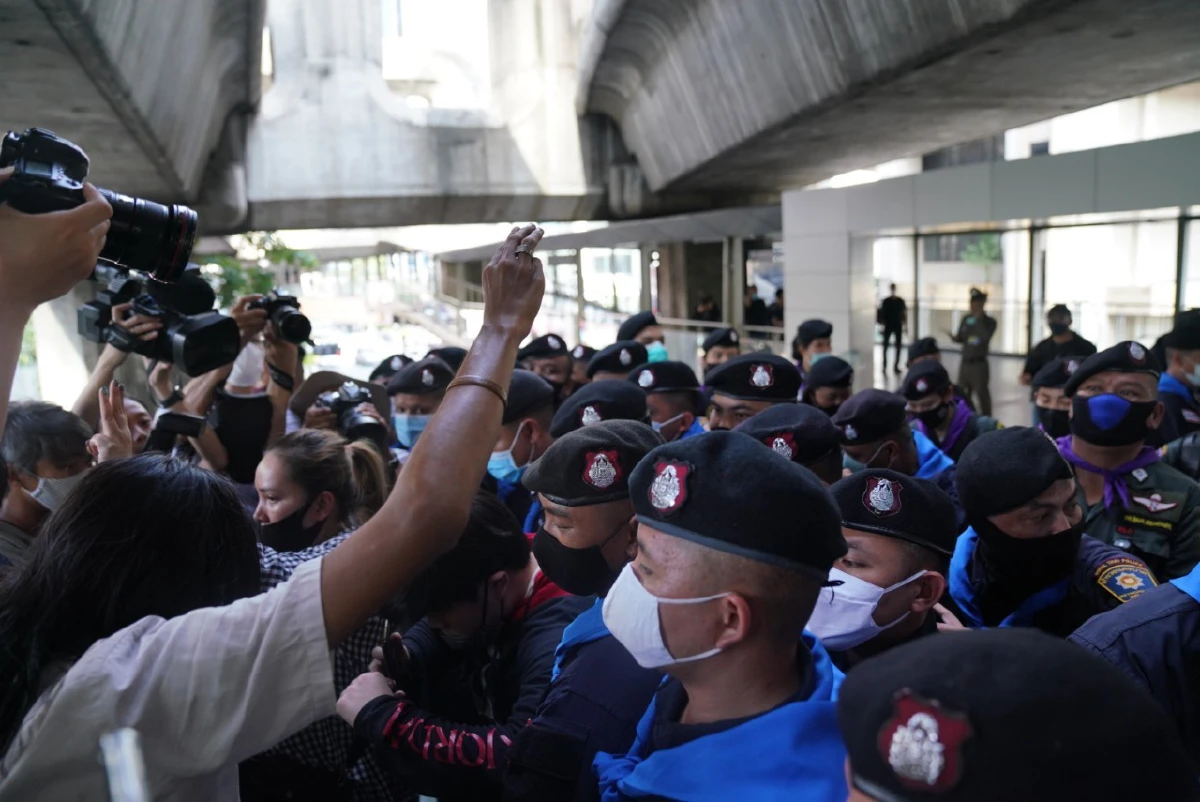 กำลังเจ้าหน้าที่ตำรวจเข้าผลักดันผู้ชุมนุมคณะราษฎรไม่ให้มีการรวมตัวกันที่แยกราชประสงค์ ทั้งบนสกายวอล์คและทางเท้าริมถนน