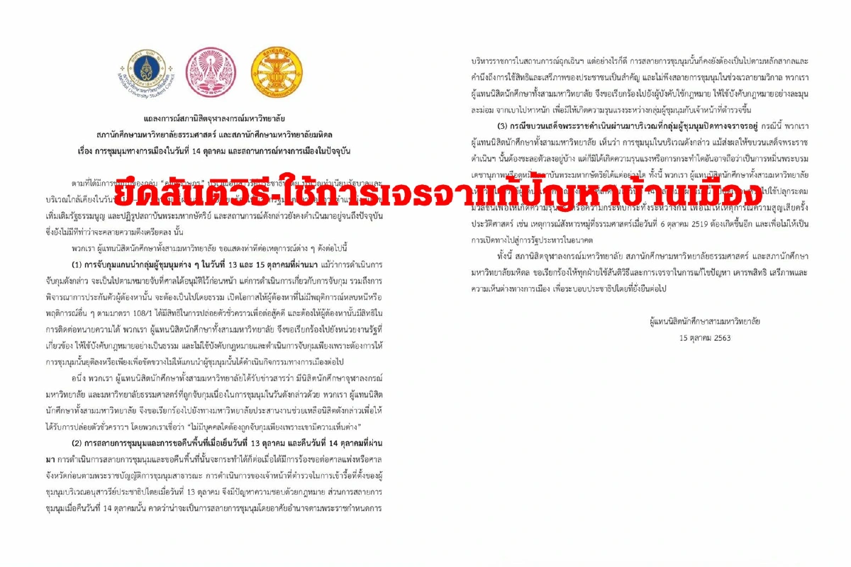 ตามที่ได้มีการชุมนุมของกลุ่ม “คณะราษฎร” บริเวณอนุสาวรีย์ประชาธิปไตย บริเวณทำเนียบรัฐบาลและบริเวณใกล้เคียงในวันที่ 13 – 15 ตุลาคม ที่ผ่านมา เพื่อเรียกร้องให้นายกรัฐมนตรีลาออกจากตำแหน่ง แก้ไขเพิ่มเติมรัฐธรรมนูญ และปฏิรูปสถาบันพระมหากษัตริย์ และสถานการณ์ดังกล่าวยังคงดำเนินมาอยู่จนถึงปัจจุบันซึ่งยังไม่มีทีท่าว่าจะคลายความตึงเครียดลง นั้นพวกเรา ผู้แทนนิสิตนักศึกษาทั้งสามมหาวิทยาลัย ขอแสดงท่าทีต่อเหตุการณ์ต่าง ๆ ดังต่อไปนี้