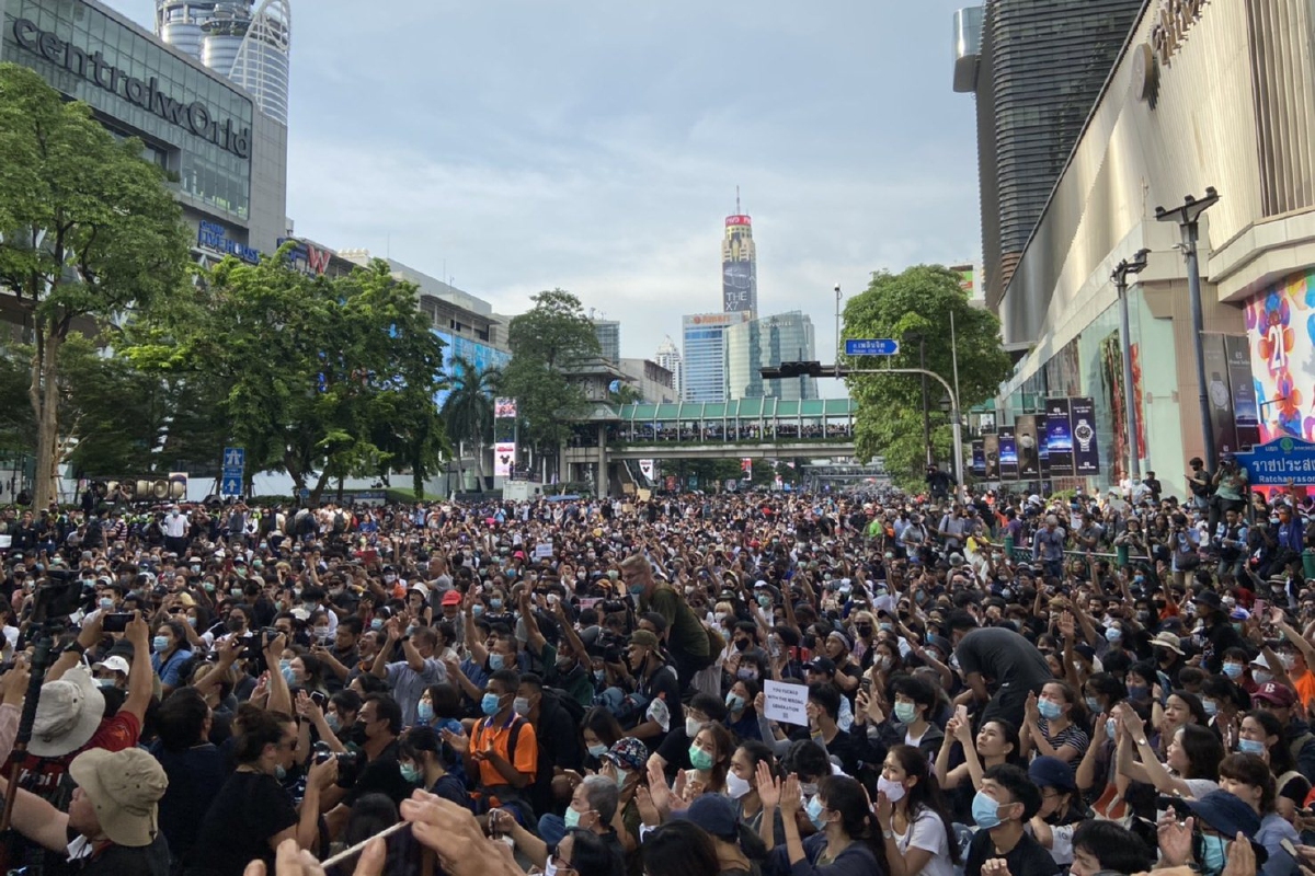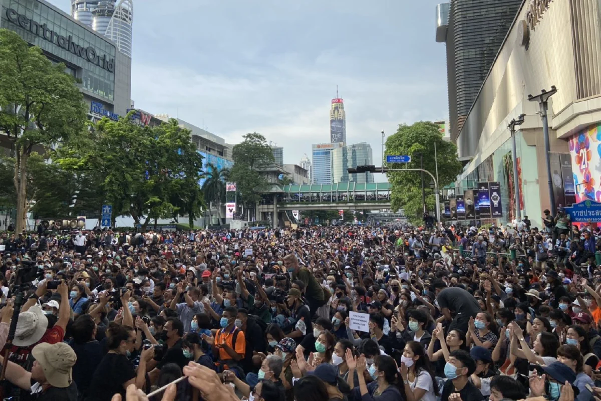 ผู้ชุมนุมคณะราษฎรปักหลักชุมนุมกลางแยกราชประสงค์ ท่ามกลางเจ้าหน้าที่ที่ตรึงกำลังอยู่โดยรอบ "ไมค์ ระยอง" ประกาศชัยชนะยึดพื้นที่ได้และจะไม่มีการถอยอีกแล้ว