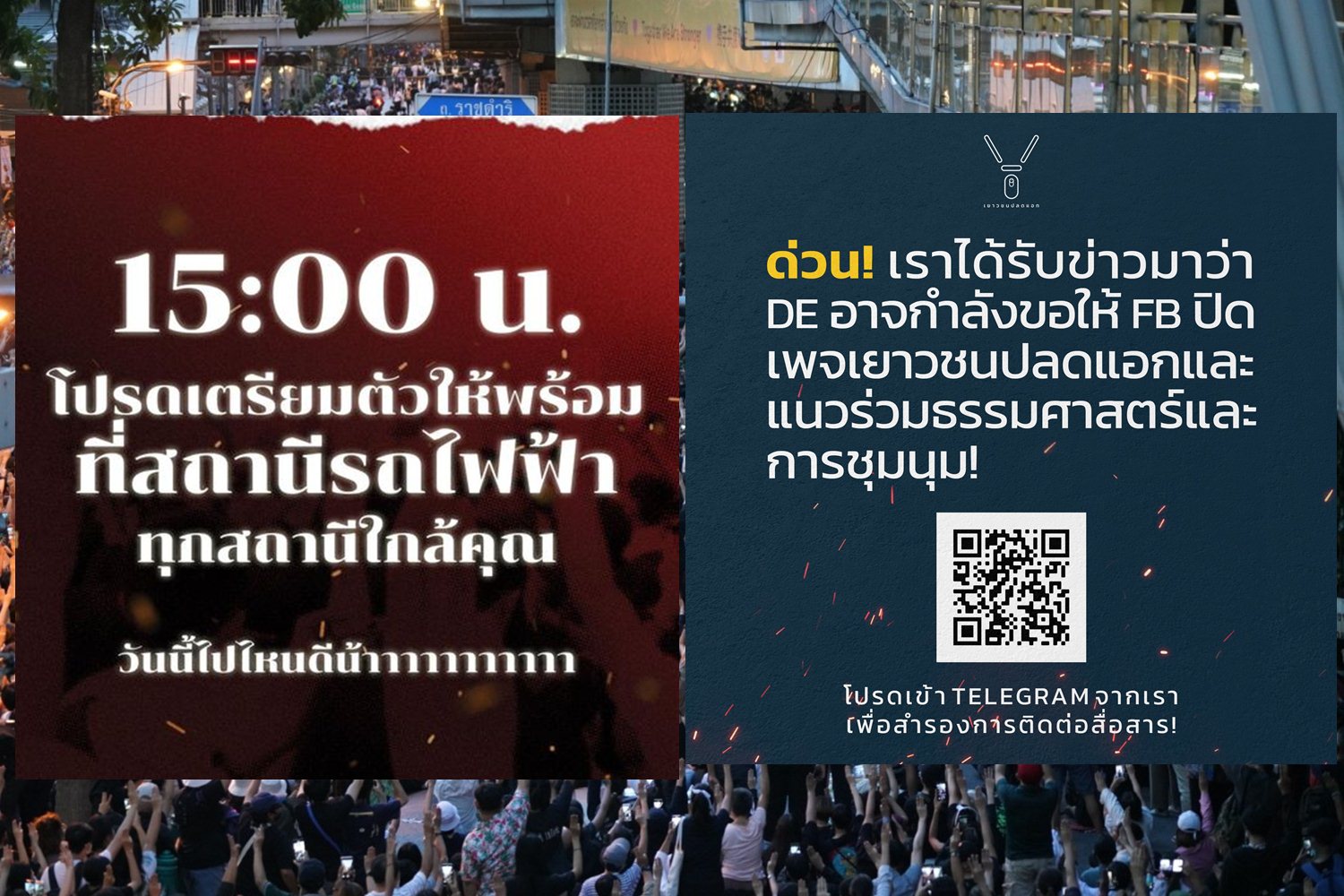 กลุ่มราษฎรนัดรวมตัว 15.00 น. ที่รถไฟฟ้าทุกสถานี เผยอาจเจอรัฐประสานเฟซบุ๊กให้ปิดเพจ เยาวชนปลดแอก และแนวร่วมธรรมศาสตร์