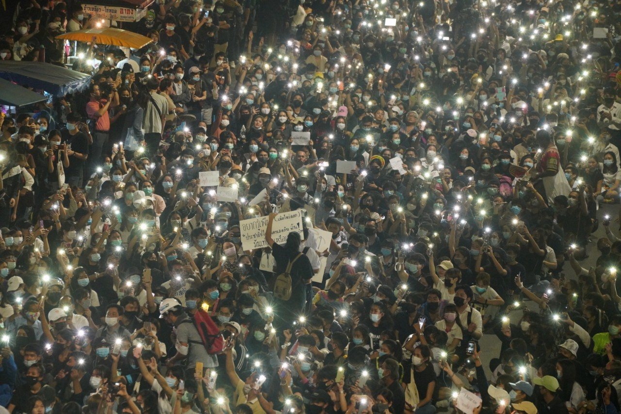 ม็อบราษฎรที่แยกเกษตรร่วมเปิดไฟฉายจากโทรศัพท์มือถือเพื่อแสดงสัญลักษณ์ขับไล่เผด็จการ ก่อนยุติการชุมนุม