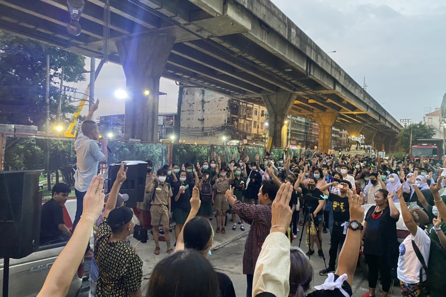 กลุ่มนักเรียนนักศึกษาไปรวมตัวหน้าสน.หัวหมาก ชูสามนิ้ว หลังเหตุเผชิญหน้าและชกต่อยกับกลุ่มเสื้อเหลืองปกป้องสถาบันในม.รามคำแหง
