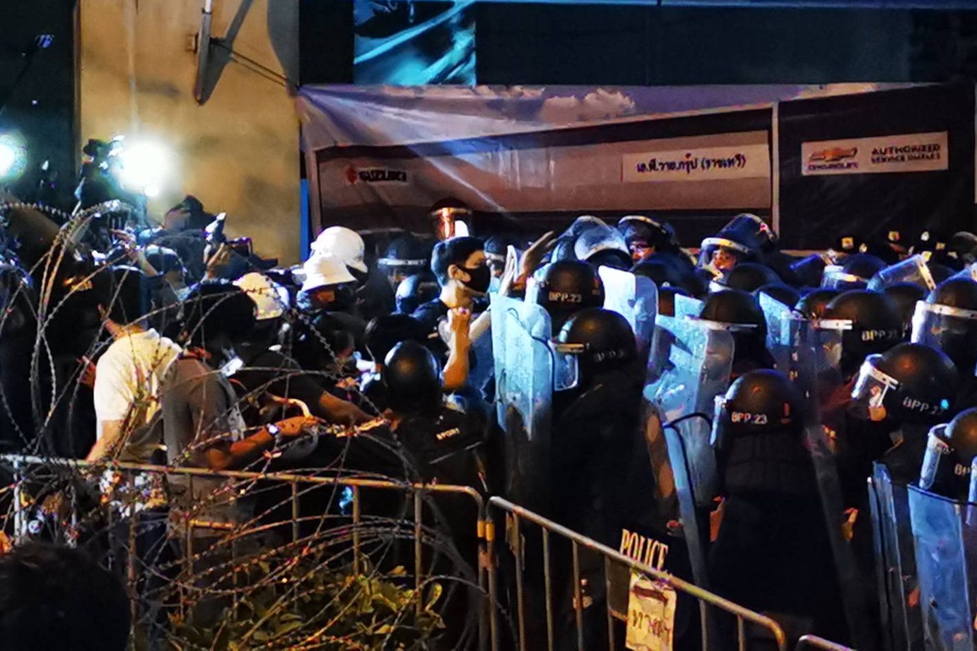 อย่างไรก็ตามผู้ชุมนุมบางส่วนได้พยายามตะโกนแจ้งให้ผู้ชุมนุมด้วยกัน นั่งลงกับพื้น และอย่าดันเข้ามาที่แนวเจ้าหน้าที่ตำรวจ
