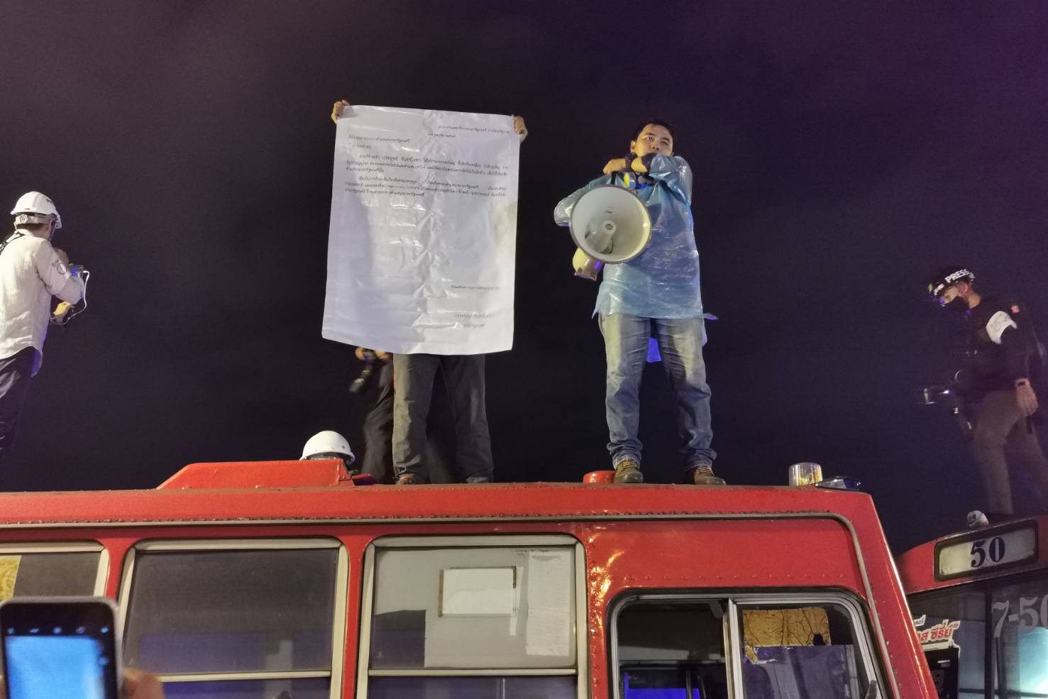 นายกรกช แสงเย็นพันธ์ นักกิจกรรมกลุ่มพื้นฟูประชาธิปไตย หนึ่งในแกนนำในการชุมนุมได้ขึ้นไปบนหลังคารถเมล์ที่ตำรวจนำมาจอดขวางไว้ พร้อมประกาศว่า ถือเป็นชัยชนะของประชาชนที่เดินทางมาถึงทำเนียบรัฐบาลแล้ว และการเดินทางมาในครั้งนี้ก็เพื่อมาเรียกร้องให้ พล.อ.ประยุทธ์ จันทร์โอชา นายกรัฐมนตรีลาออก