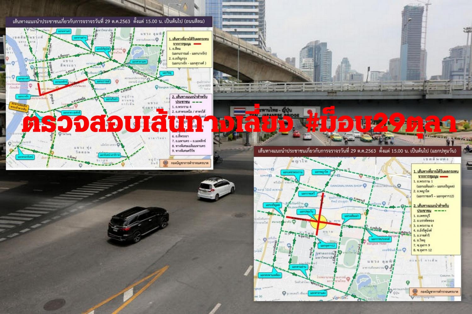 พล.ต.ต.จิรสันต์ แก้วแสงเอก รอง ผบช.น. และ พล.ต.ต.ธีระพงษ์ วงษ์รัฐพิทักษ์ ผบก.จร. ขอประชาสัมพันธ์ข่าวสารให้ประชาชนผู้ใช้รถใช้ถนนได้รับทราบ กรณีวันที่ 29 ต.ค 2563 ตามที่ปรากฎทางสื่อโซเชียลมีเดีย ได้มีประกาศนัดรวมตัวของกลุ่มผู้ชุมนุมฯ บริเวณสกายวอล์ค MBK ในเวลา 17.30 น. และ บริเวณถนนสีลม ในเวลา 17.00 น. นั้น เนื่องด้วยบริเวณพื้นที่การนัดหมายชุมนุมฯ ดังกล่าวเป็นพื้นที่ที่มีการจราจรหนาแน่น เป็นเส้นทางสายหลักซึ่งประชาชนใช้ในการสัญจร โดยเฉพาะในช่วงเวลาเร่งด่วน เพื่อความสะดวกในการเดินทางของพี่น้องประชาชน จึงขอแจ้งข้อมูลข่าวสารการจราจร โดยขอให้หลีกเลี่ยงเส้นทางตั้งแต่เวลา 15.00 น. เป็นต้นไป จนเสร็จสิ้นการชุมนุม ดังนี้