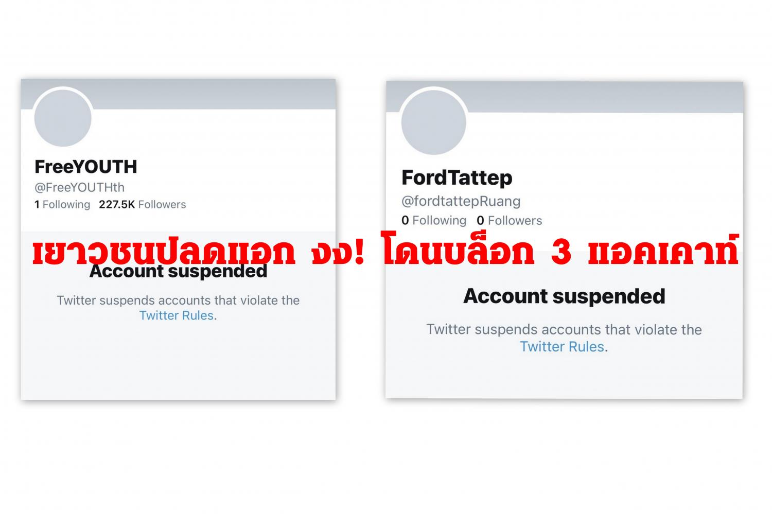 มีรายงานว่า แอคเคาท์ทวิตเตอร์ @freeyouthth ซึ่งเป็นของ “เยาวชนปลดแอก - Free YOUTH” และแกนนำบางคน เช่น @fordtattepRuang ซึ่งเป็นของ “นายฟอร์ด ทัตเทพ” ถูกระงับการใช้งาน เนื่องจาก“ละเมิดข้อบังคับของทวิตเตอร์”
