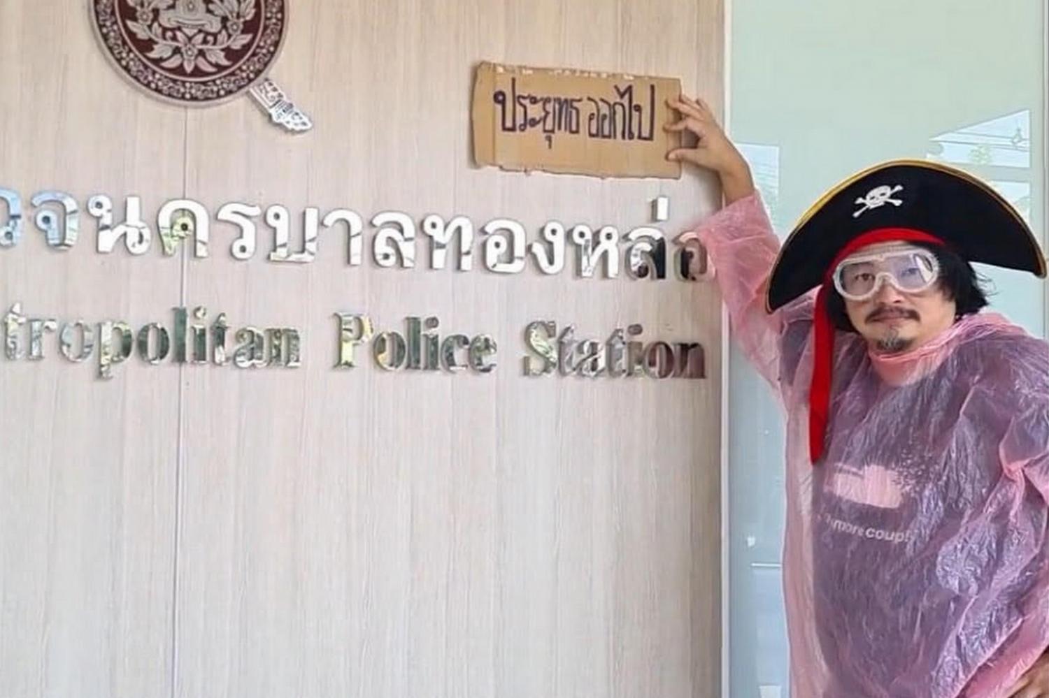 ตำรวจถามว่า ใส่เสื้อกันฝนกับหมวกโจรสลัดมาทำไม ตอบ...ช่วงนี้เจอตำรวจต้องระวังโดนฉีดน้ำ ส่วนโจรสลัดกับตำรวจอันนี้ไม่น่าถาม